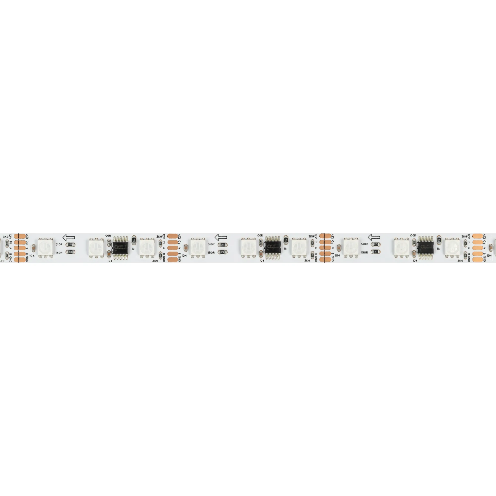 Светодиодная лента DMX серии B60 с микросхемой GS8526. Светодиоды SMD 5060, 60 шт/м, 20 pixels на 1 м (100 pixels на 5 м), 1 pixel = 3 светодиода, белая плата шириной 10 мм, скотч 3М. Цвет RGB, угол 120°. Питание 12 В, мощность 14 Вт/м (70 Вт на 5 м). Размеры 5000x10x2.2 мм. Мин. отрезок 50 мм, 3 светодиода. Цена за 1 м.