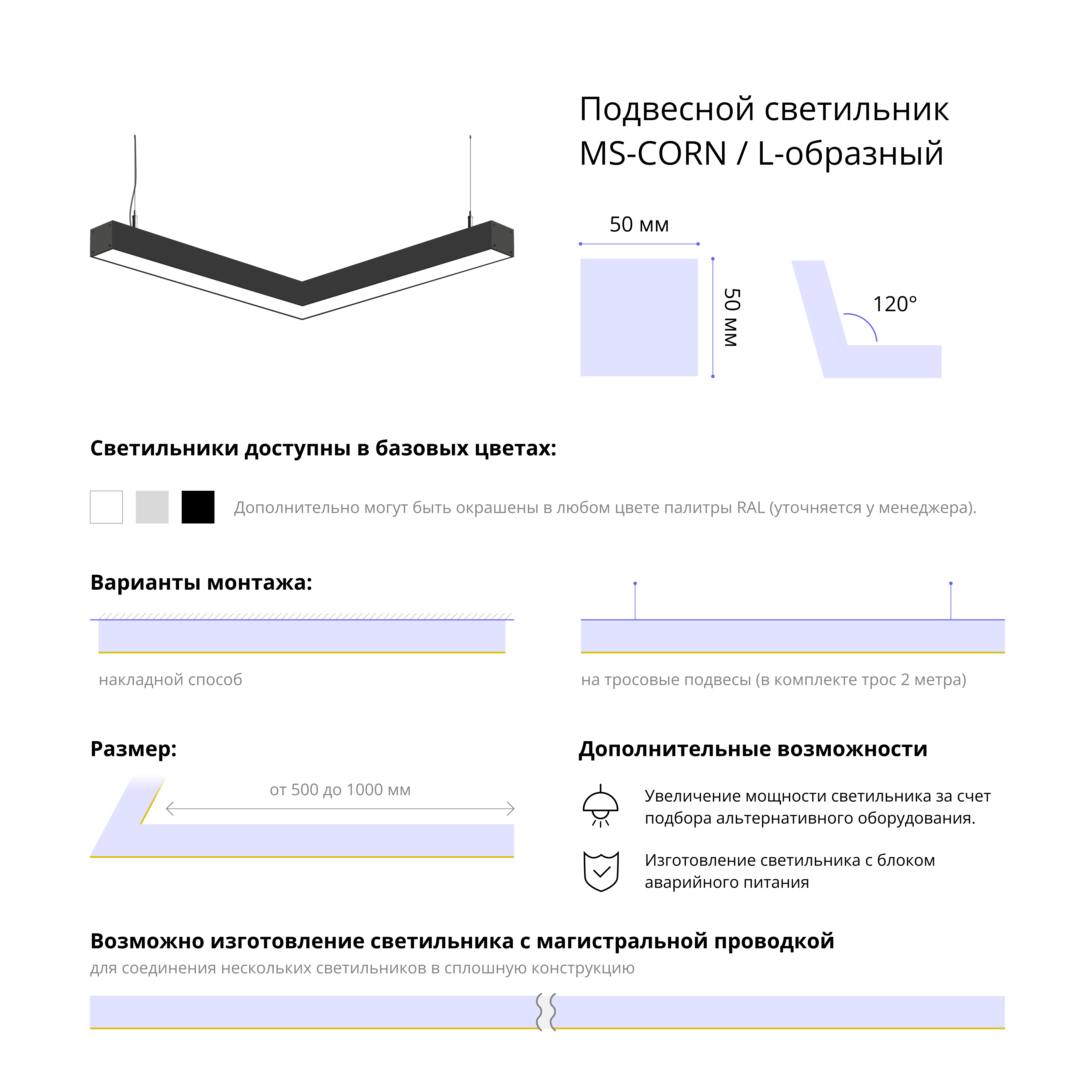 - Варианты монтажа: на тросовые подвесы (в комплекте трос 2 метра) и накладным способом.