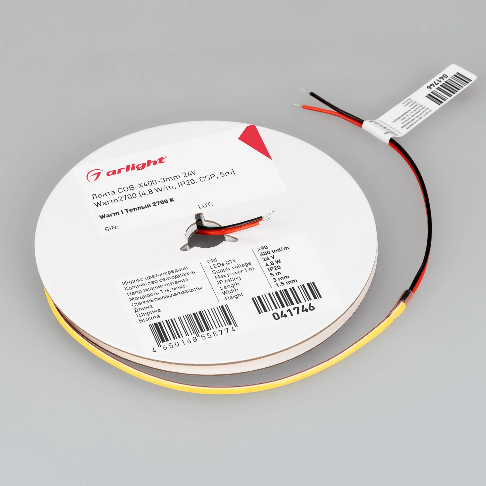 В магазине Арлед Маркет Вы можете купить "Лента светодиодная COB-X400-3mm 24V Warm2700 (4.8 W/m, IP20, CSP, 5m) (Arlight, -)"