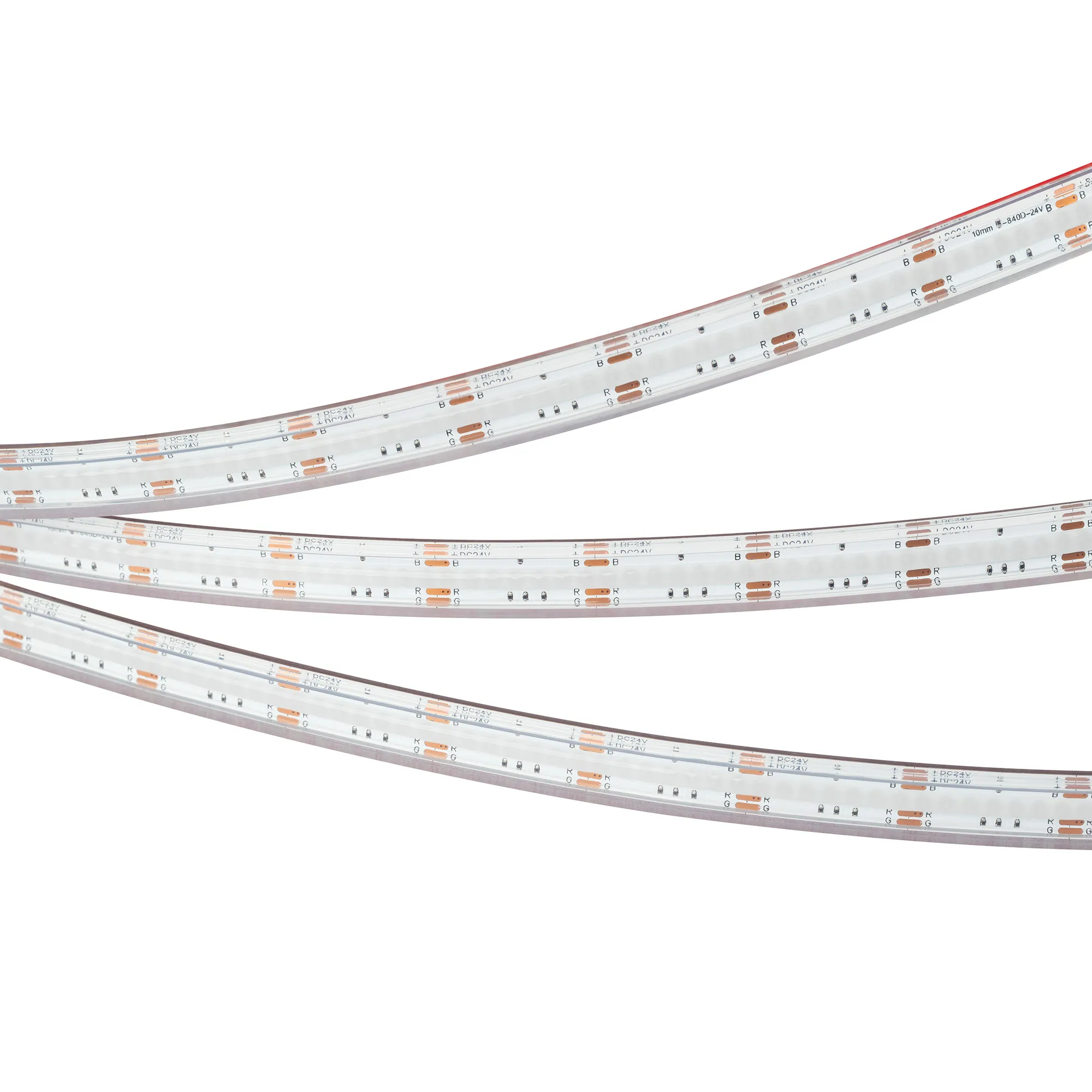 Мультицветная светодиодная герметичная лента сплошного свечения COB серии X840, IP67 (PS - силиконовая экструзия). Светодиоды CSP, 840 шт/м, белая плата шириной 10 мм, скотч 3M. Цвет RGB, угол 160°. Питание 24 В, мощность 16 Вт/м (80 Вт на 5 м). Размеры 5000x12x4.5 мм. Мин. отрезок 25 мм. Цена за 1 м. Обязательна установка на профиль.