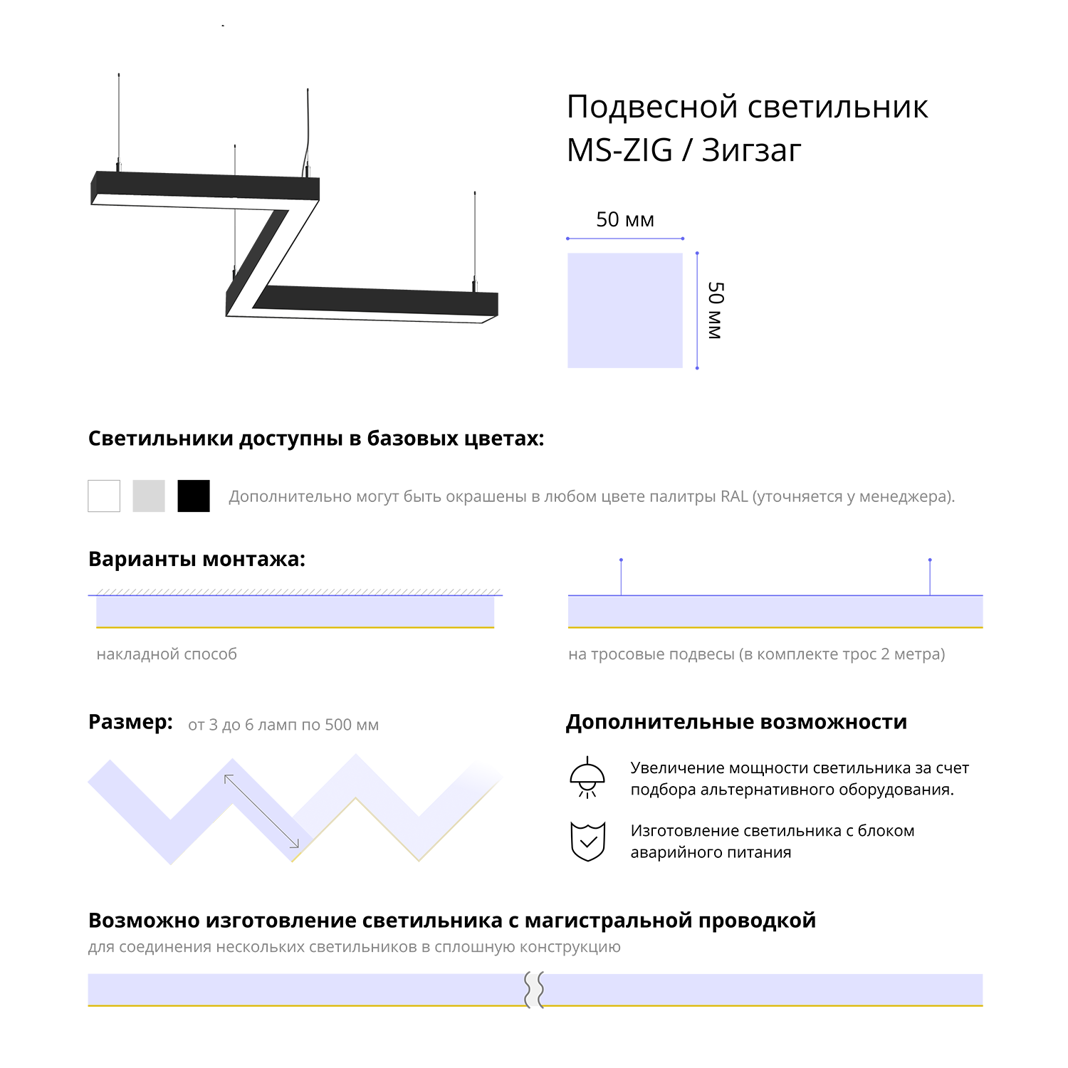 - Варианты монтажа: на тросовые подвесы (в комплекте трос 2 метра) и накладным способом.