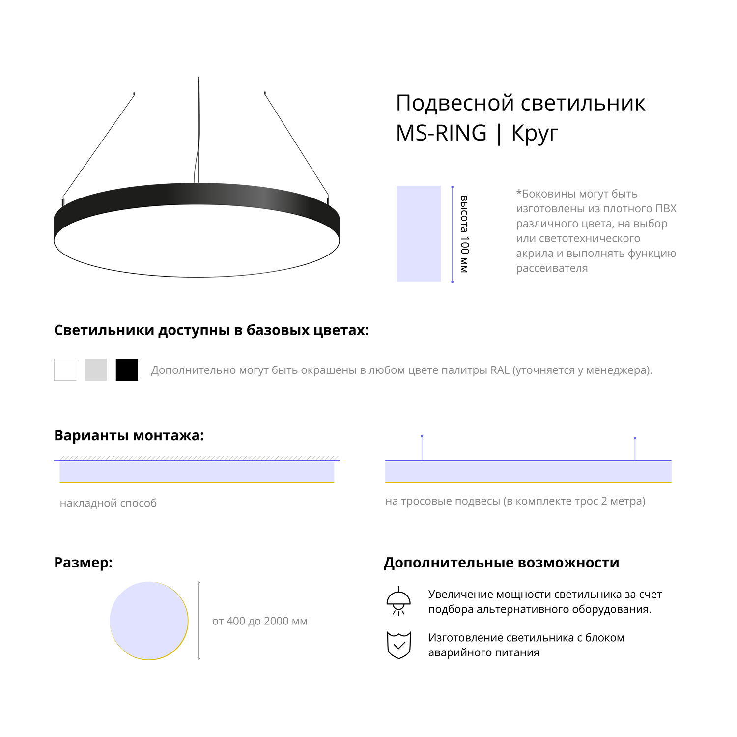 - Варианты монтажа: на тросовые подвесы (в комплекте трос 2 метра) и накладным способом.
