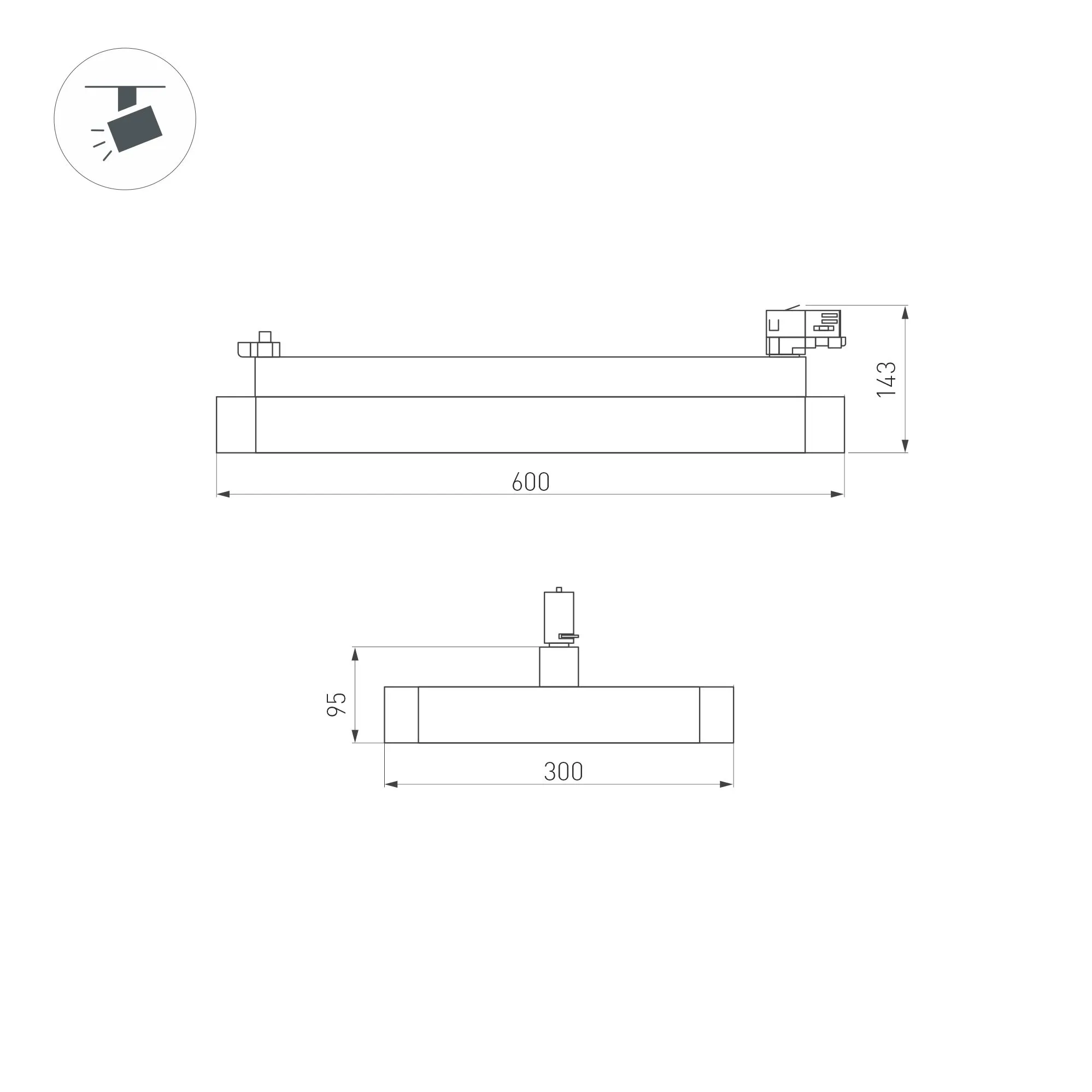 Светильник подвесной для треков/шин 4 провода. Мощность 50 Вт, св. поток 4200 лм, 85 лм/Вт, дневной 4000 K, CRI>90, угол 110°, напряжение питания 230 В. Черный корпус из алюминия, материал рассеивателя PC, степень защиты IP20. Размер: длина 600 мм, ширина 300 мм, высота 50 мм. Монтаж на трек 3-фазный. Драйвер 27-40 В, 1400 мА, пульсация <1%.