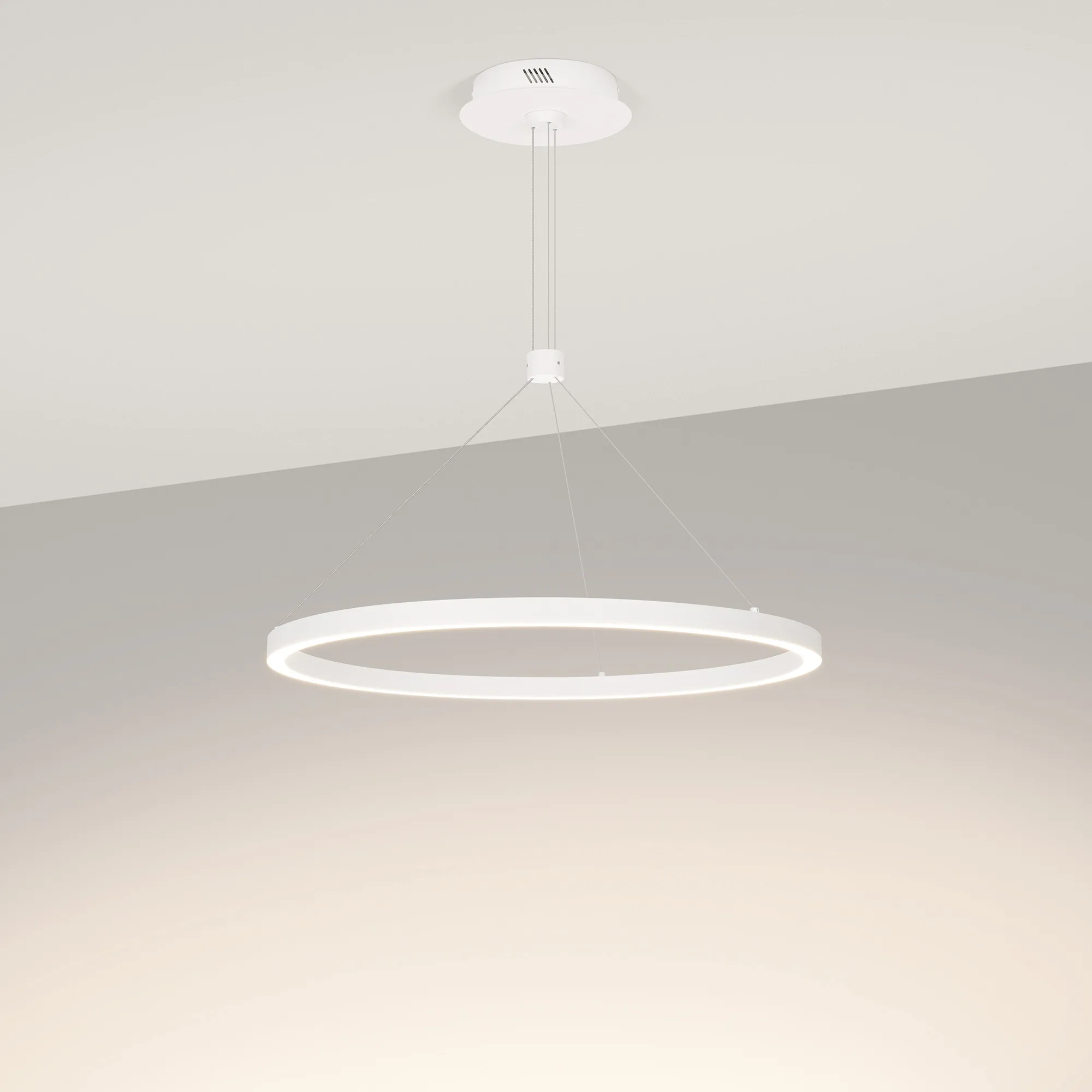 Подвесной светильник. Мощность 36 Вт, св. поток 2050 лм, 57 лм/Вт, дневной 4000 K, CRI>90, угол 120°, напряжение питания 230 В. Белый круглый корпус из алюминия, экран силикон, степень защиты IP20. Размер: диаметр 600 мм, высота 25 мм, ширина профиля 25 мм, размер чаши: диаметр 170 мм, высота 40 мм. Монтаж подвесной, длина подвеса 1200мм. Драйвер 33-40 В, 900 мА. Пульсация <5%.