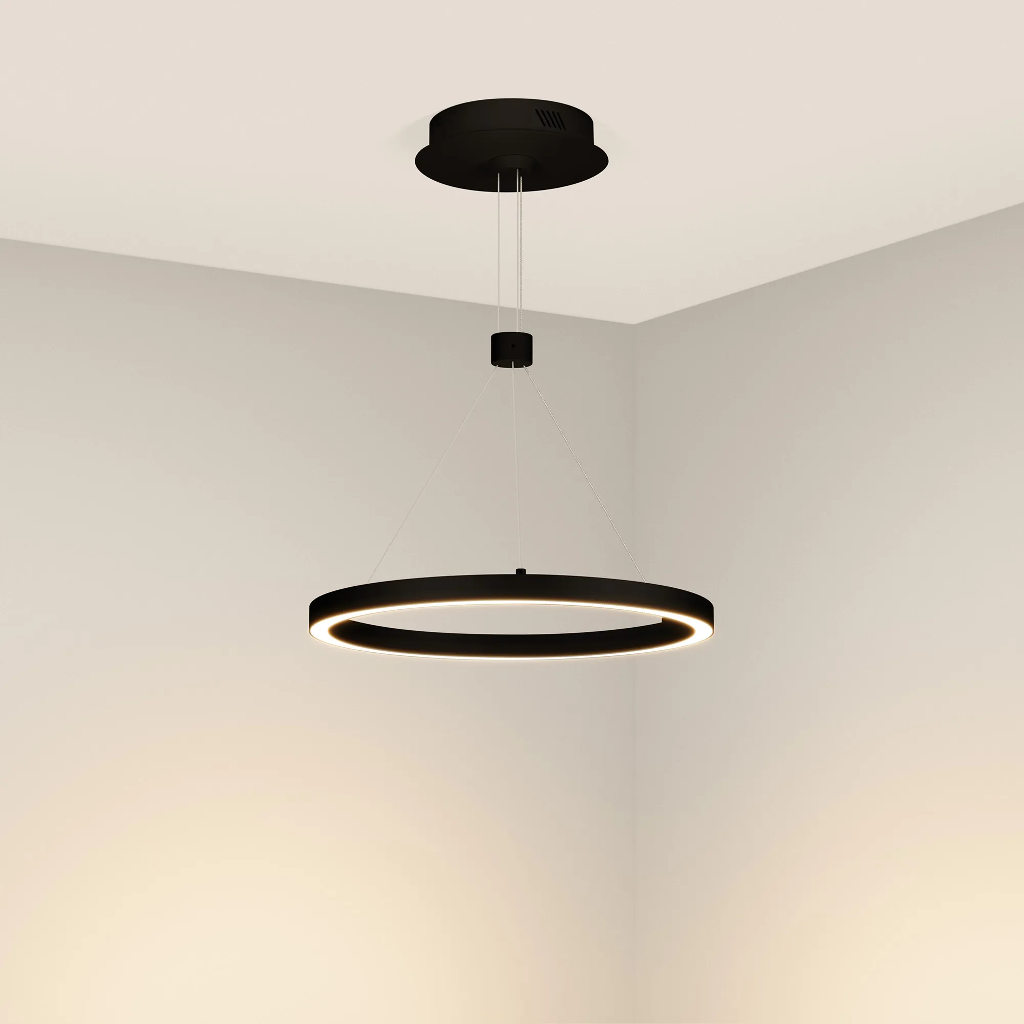 Подвесной светильник. Мощность 24 Вт, св. поток 1340 лм, 56 лм/Вт, тёплый 3000 K, CRI>90, угол 120°, напряжение питания 230 В. Черный круглый корпус из алюминия, экран силикон, степень защиты IP20. Размер: диаметр 400 мм, высота 25 мм, ширина профиля 25 мм, размер чаши: диаметр 170 мм, высота 40 мм. Монтаж подвесной, длина подвеса 1200мм. Драйвер 33-40 В, 600 мА Пульсация <5%.
