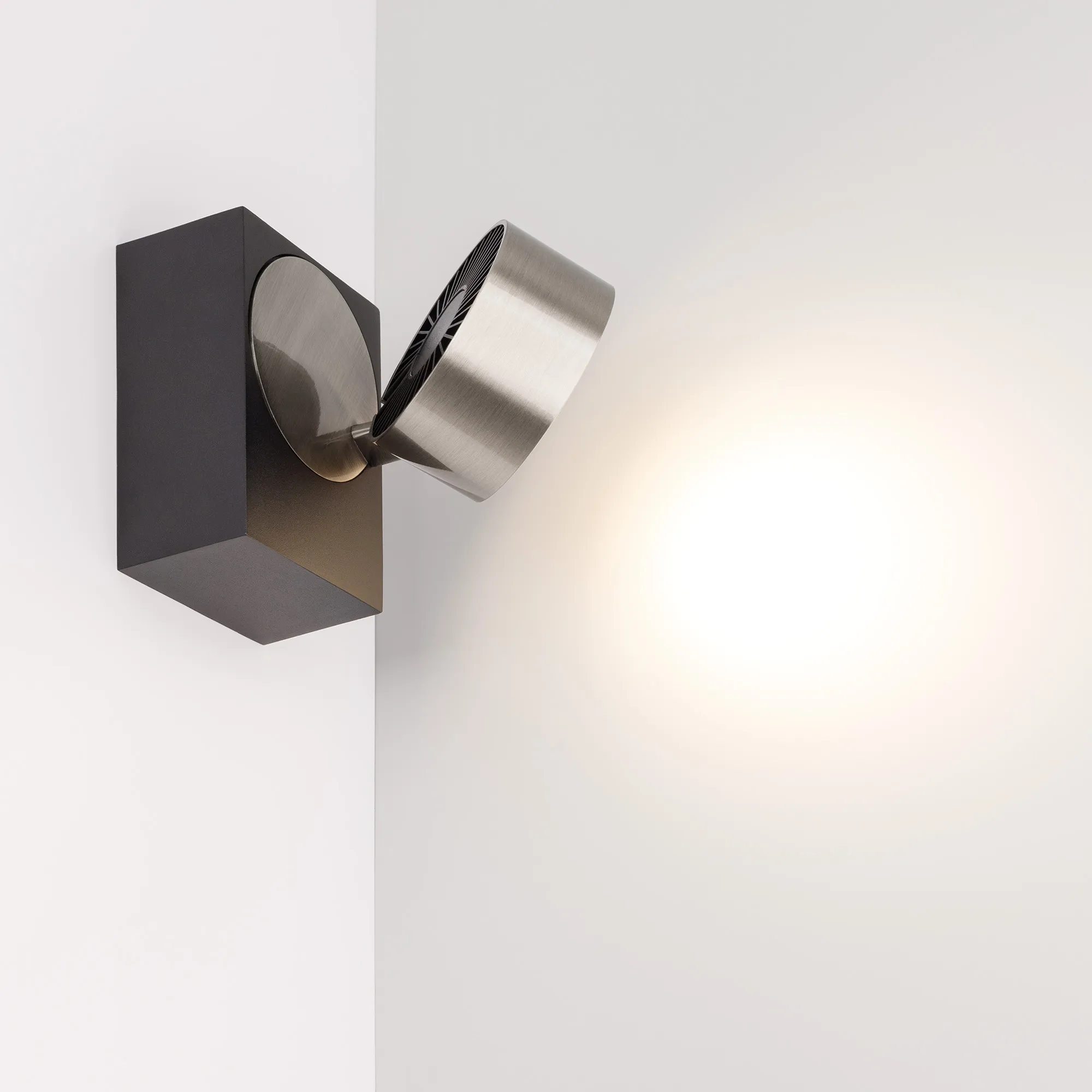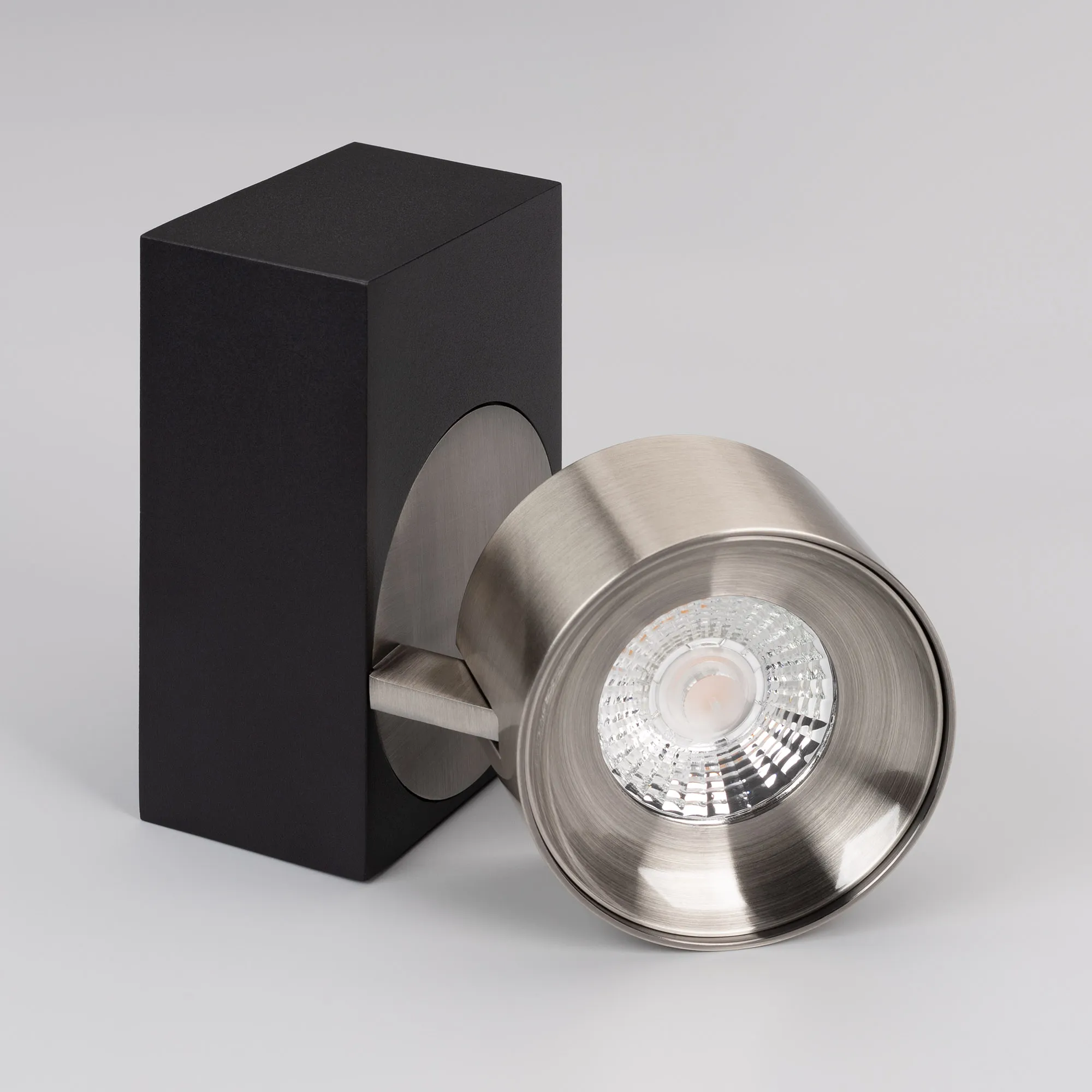 Светильник накладной поворотный. Мощность 9 Вт, св. поток 600 лм, 67 лм/Вт, дневной 4000 K, CRI>90, угол 36°, напряжение питания 230 В. Модуль Цвета Никель, Черный прямоугольный корпус из алюминия, экран поликарбонат, степень защиты IP20. Размер: длина 110 мм, ширина 77 мм, высота 93 мм. Монтаж накладной. Драйвер 38 В, 200 мА, пульсация <1%.