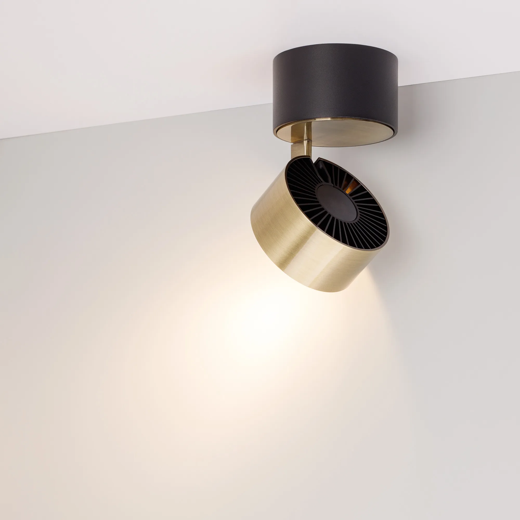 Светильник накладной поворотный. Мощность 9 Вт, св. поток 550 лм, 61 лм/Вт, теплый 3000 K, CRI>90, угол 36°, напряжение питания 230 В. Модуль Цвета Темная Латунь, Черный круглый корпус из алюминия, экран поликарбонат, степень защиты IP20. Размер: диаметр 77 мм, высота 92 мм. Монтаж накладной. Драйвер 38 В, 200 мА, пульсация <1%.