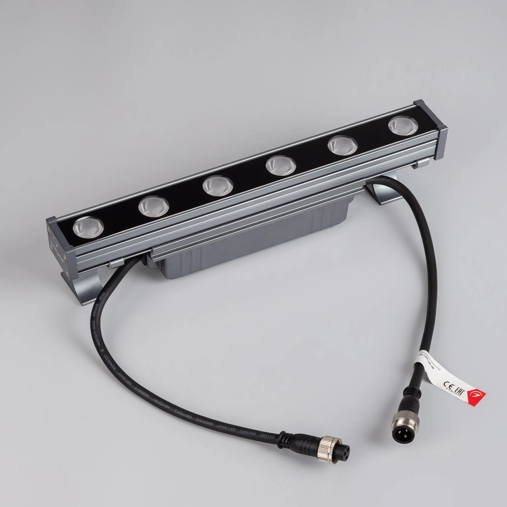 Линейный прожектор. Мощность 6 Вт, св. поток 480 лм, 80 лм/Вт, тёплый 3000 K, CRI>80, угол 15x60°, напряжение питания 230 В. Серый прямоугольный корпус из алюминия, экран стекло, степень защиты IP65. Размер: длина 300 мм, ширина 40 мм, высота 30 мм. Монтаж на кронштейнах.
