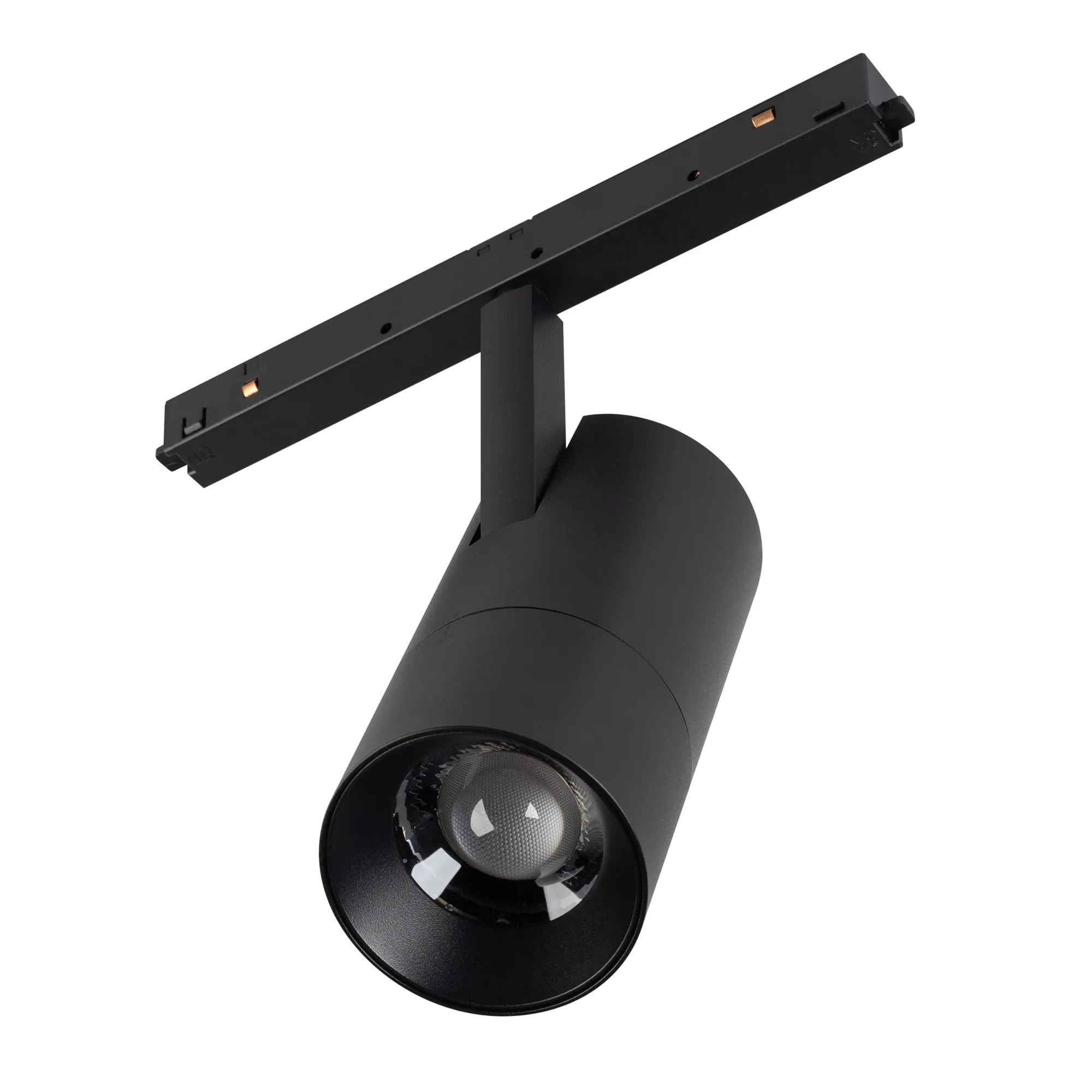 Светильник для магнитных треков MAG-ORIENT шириной 26 мм, с управлением по DALI. Мощность 15 Вт, св. поток 1100 лм, 73 лм/Вт, дневной 4000 K, CRI>94, угол 34-60°, напряжение питания 48 В. Черный фигурный корпус из металл, экран поликарбонат, степень защиты IP20. Размеры LxWxH 204x66x211 мм.