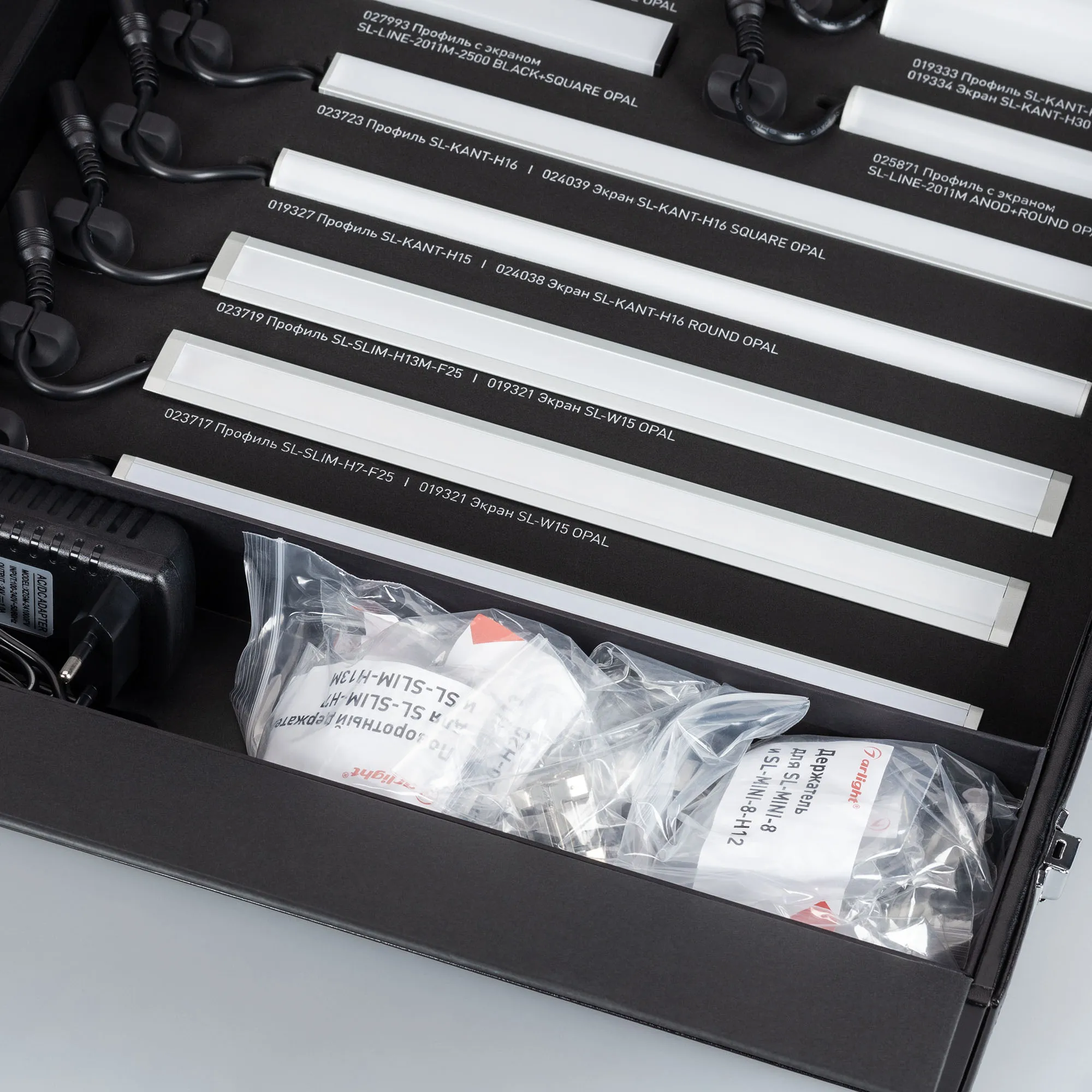 Демонстрационный набор обновлённых профилей серий SL-LINE-2011, SL-KANT-H16/H30, SL-SLIM/SLIM20, SL-MINI-8. Включает отрезки профиля с экраном и заглушками по 20см со светодиодной лентой 24В. Также в комплекте блок питания.