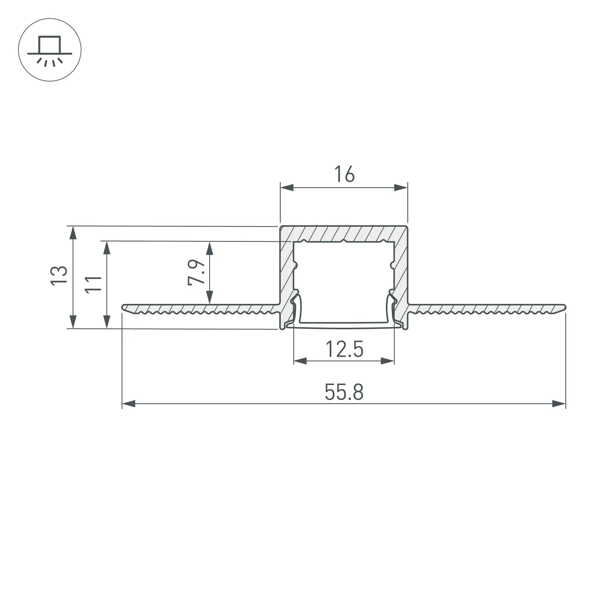 Алюминиевый анодированный профиль для светодиодных лент и линеек. Скрытая установка (под строительную отделку). Габаритные размеры (L×W×H): 2000x55,8x13 мм. Ширина площадки для ленты 12,5 мм. Экраны, заглушки и другие аксессуары приобретаются отдельно. Цена за 1 метр.