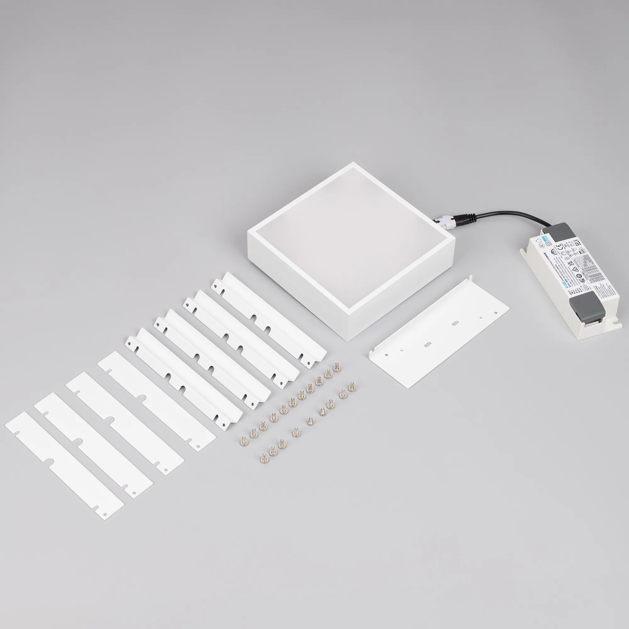 Встраиваемый светильник даунлайт для установки в потолки Грильято с размером ячейки 150х150 мм и высотой направляющих 30, 40 или 50 мм. Мощность 18 Вт, св. поток 1700 лм, 94 лм/Вт, тёплый 3000 K, CRI>90, угол 100°, напряжение питания 230 В. Белый квадратный корпус из алюминия, степень защиты IP40. Размер: длина 140 мм, ширина 140 мм, высота 40 мм. Монтаж встраиваемый, установочное отверстие: длина 140 мм, ширина 140 мм. Драйвер 24-42 В, 450 мА, пульсация <1%..