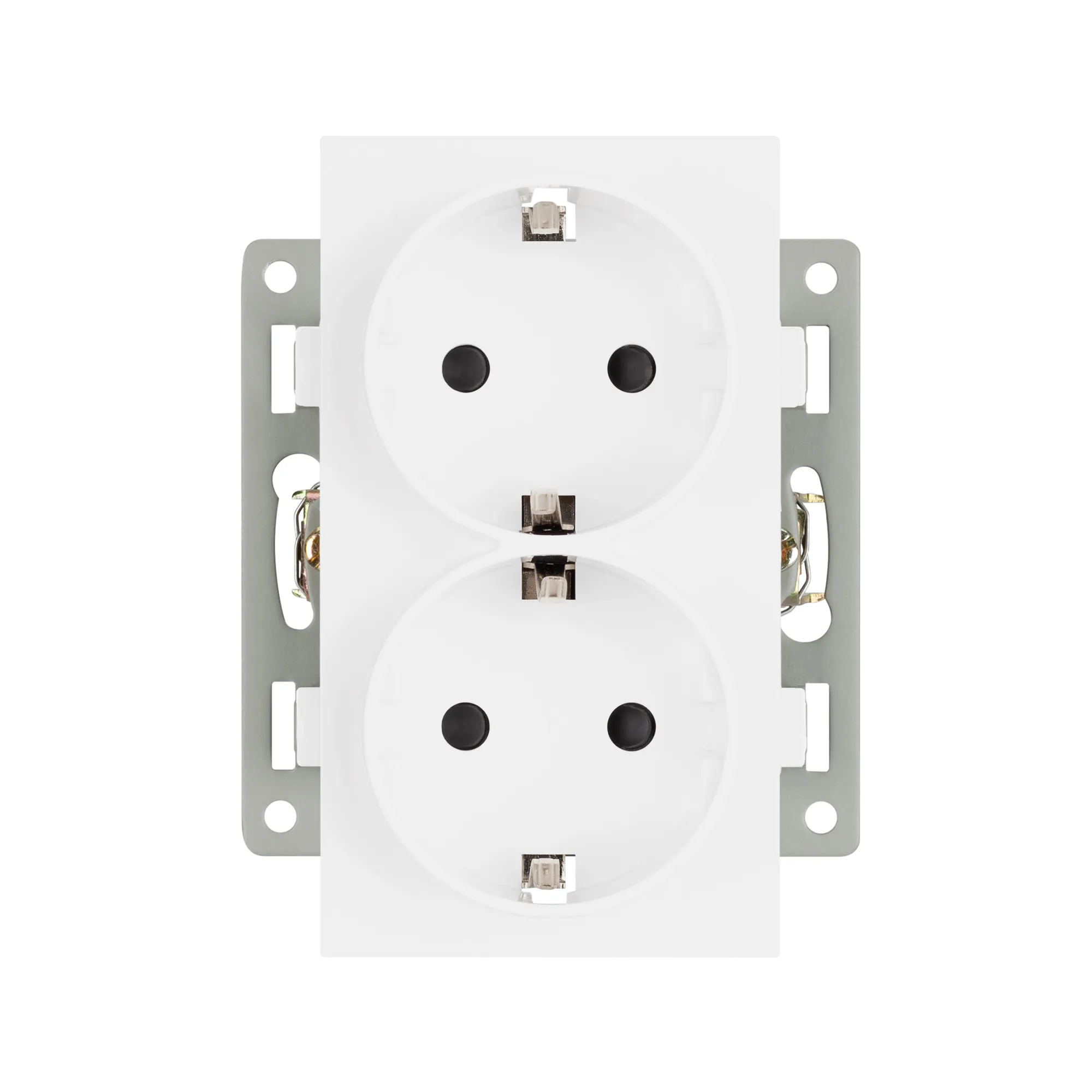 Механизм розетки вертикальный, с заземлением на 2 поста и с суппортом из алюминия. Цвет - белый. Степень пылевлагозащиты - IP20.