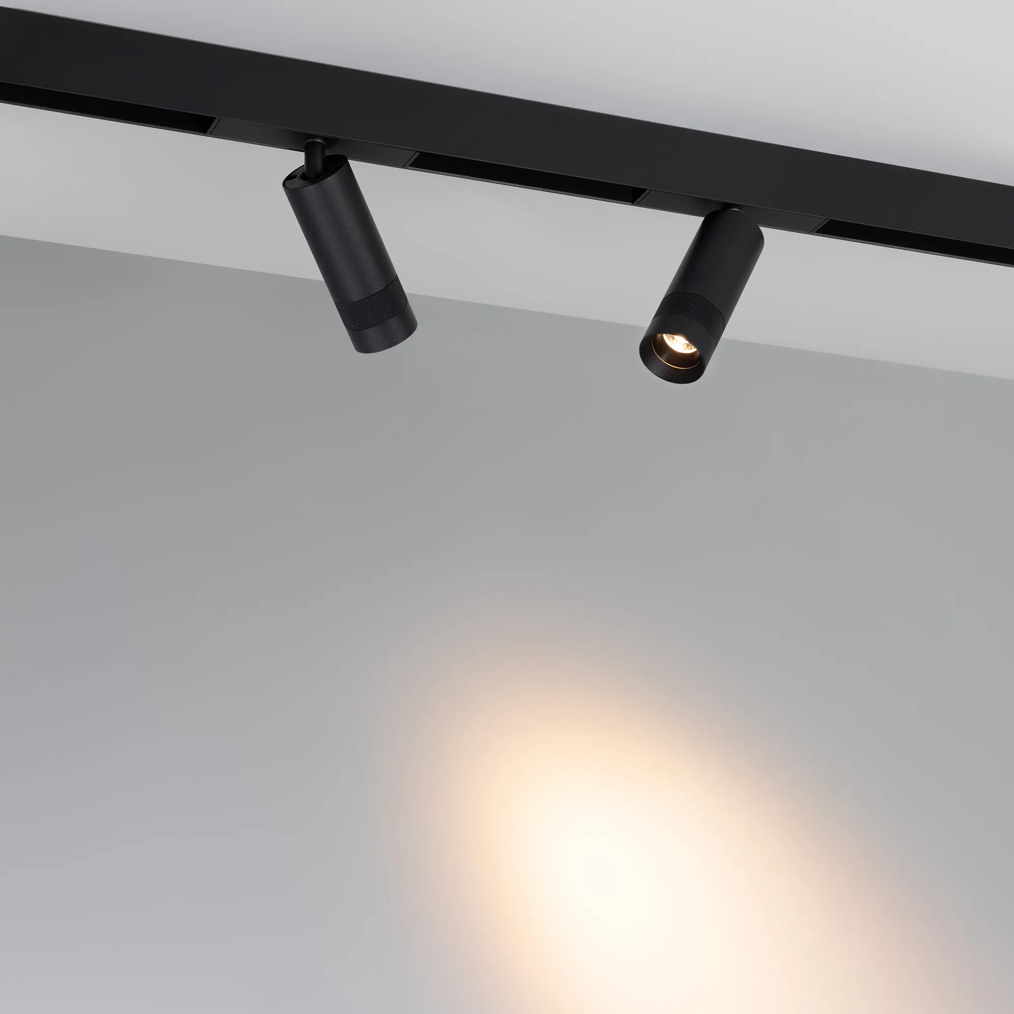 Светильник поворотный для магнитных треков шириной 25 мм, 7 Вт. Цвет свечения Теплый 3000K, световой поток 410лм, изменяемый угол излучения 20-55°, CRI>90. Корпус цилиндрический, металл, цвет черный, IP20. Размеры LxWxH 128x35x105 мм. Входное напряжение DC24V, мощность 7 Вт. Драйвер DС24V/AC230V поставляется отдельно.