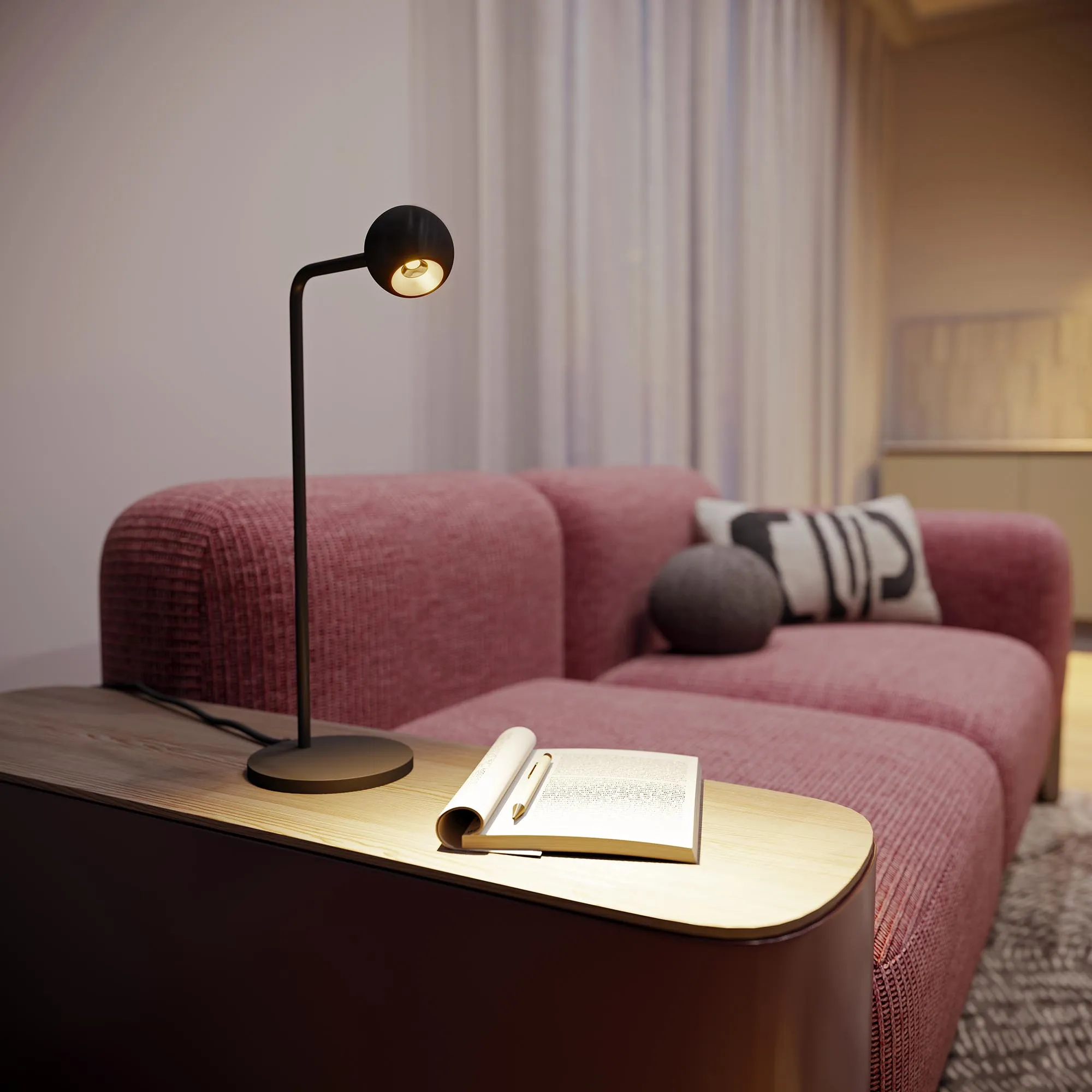 Декоративный настольный светильник. Мощность 6 Вт, св. поток 540 лм, 90 лм/Вт, теплый 3000К, CRI>90, угол 30°, напряжение питания 230 В. Белый корпус из алюминия (основание, ножка, светоизлучаль в форме шара), степень защиты IP20. Размер основания Ø140×11 мм, размер ножки Ø12,5×430х120 мм, размер светоизлучателя Ø65×55,5 мм. Длина провода 1580 мм, питание от сети 220-240V., пульсация <1%