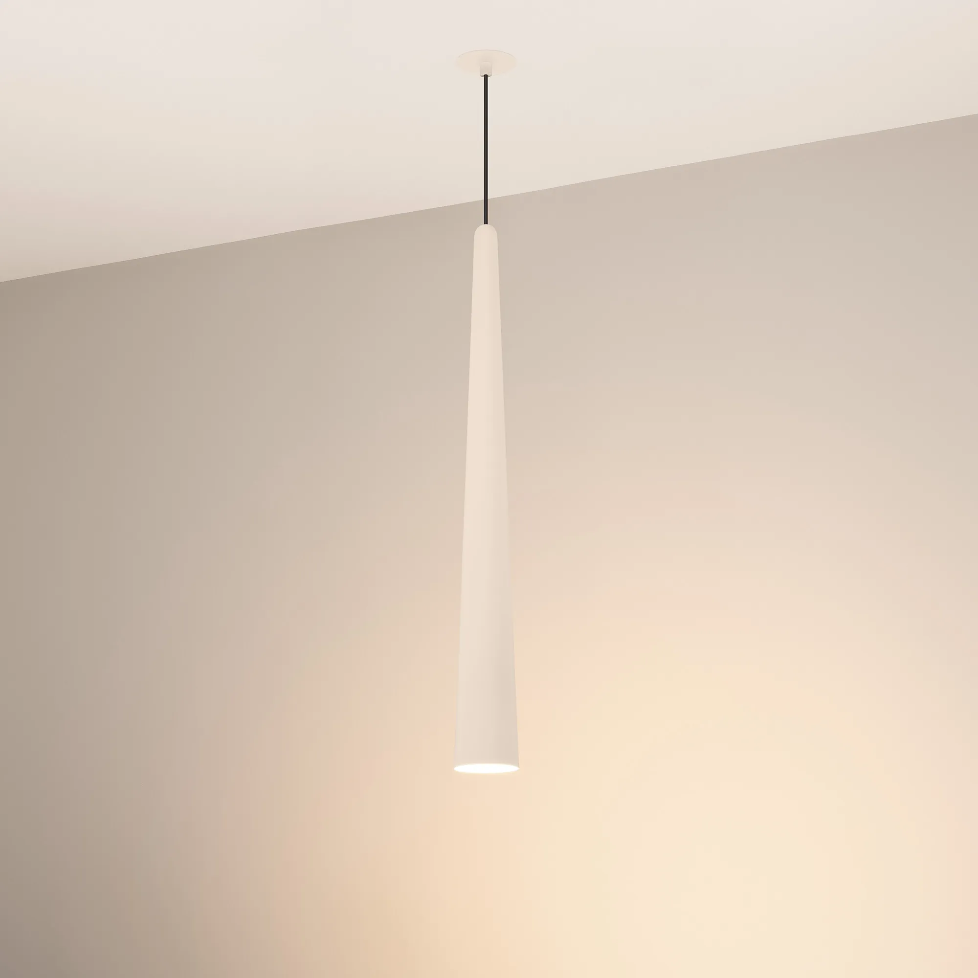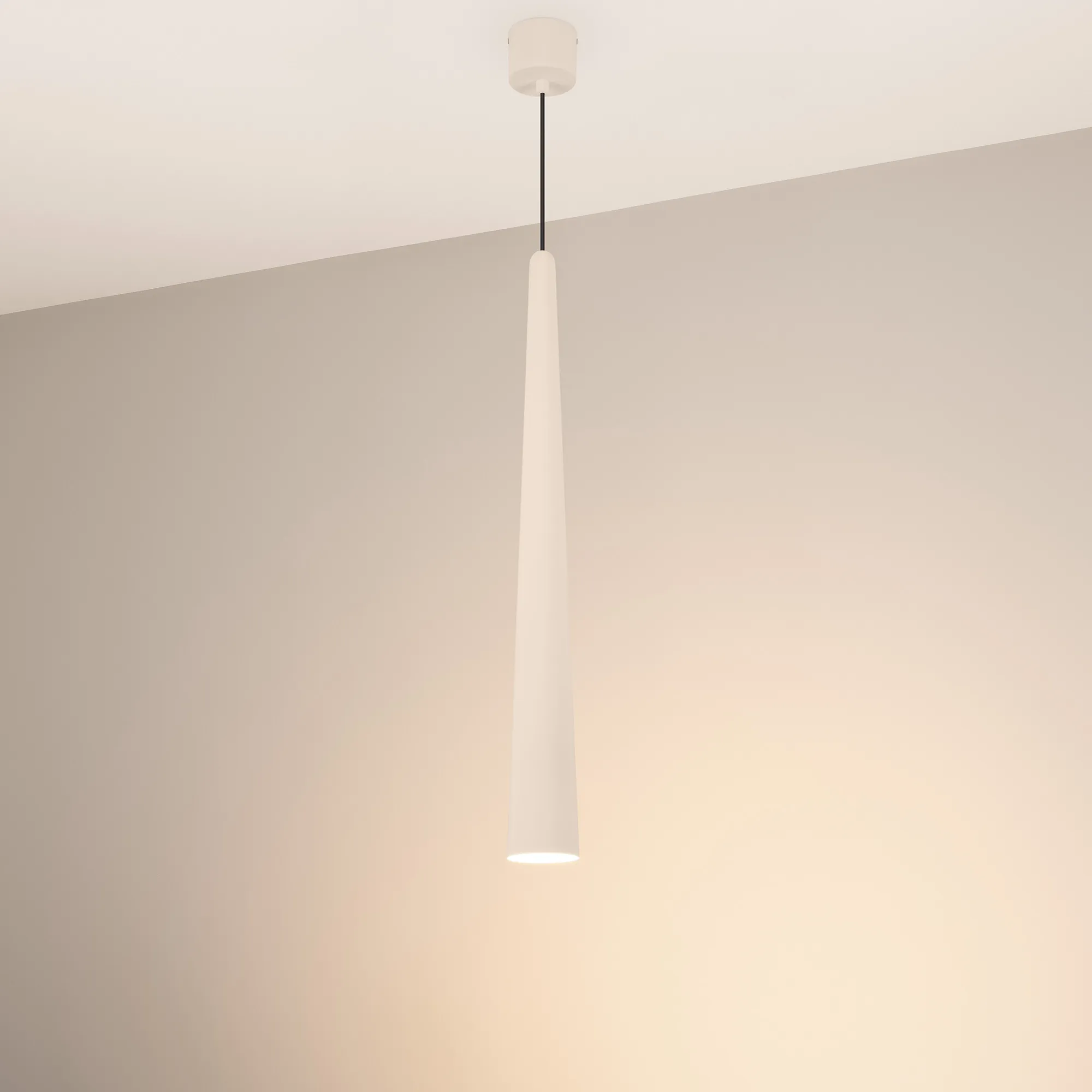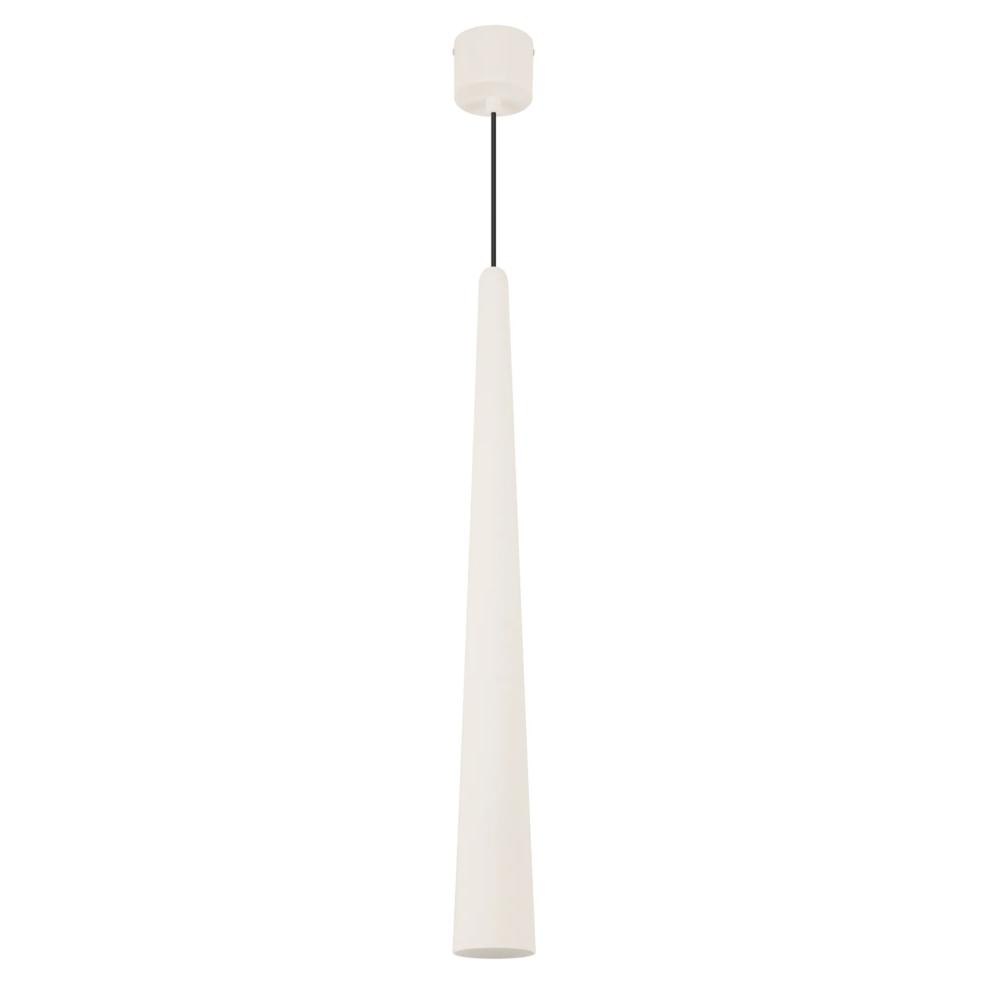Подвесной светильник. Мощность 5 Вт, св. поток 400 лм, 70 лм/Вт, теплый 3000K, CRI>92, угол 36°, напряжение питания 230 В. Кремовый конусообразный вытянутый корпус из алюминия, линза из PMMA, степень защиты IP20. Размер: диаметр 76 мм, высота 670 мм. Монтаж подвесной, длина подвеса 2000 мм, регулируемая. В комплекте 2 вида чаш. Габариты встраиваемой чаши: Ø 80x41 мм. Габариты накладной чаши Ø80x60 мм. Драйвер 2,8-12В, 500 мА, пульсация <1%.