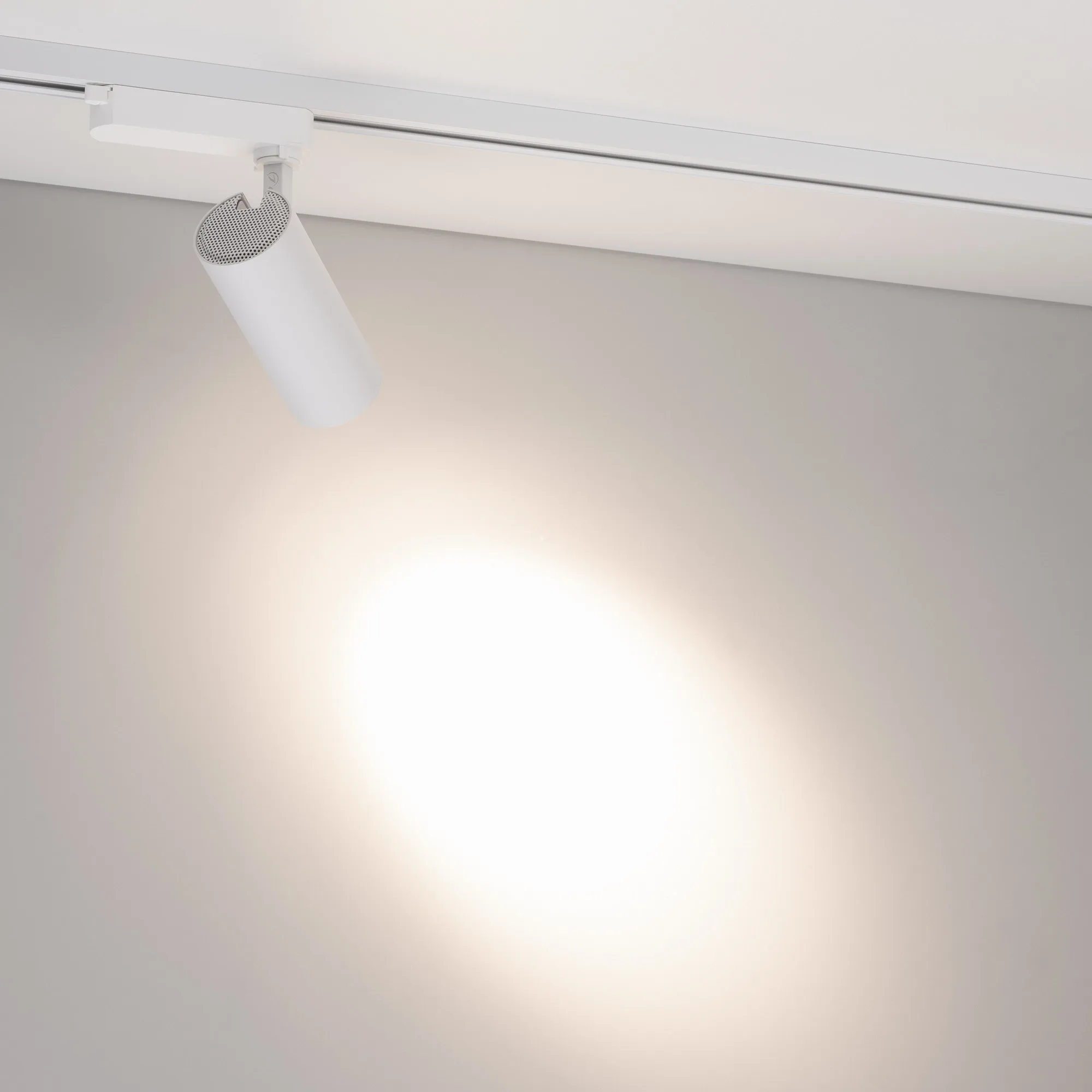 Светильник для треков/шин 2 провода. Мощность 15 Вт, св. поток без решетки honeycomb 1500 лм, 100 лм/Вт, с решеткой honeycomb 990 лм, 66 лм/Вт, дневной 4000 K, CRI>90, угол 24°, напряжение питания 230 В. Белый круглый корпус из алюминия, материал линзы PMMA, степень защиты IP20. Размер: диаметр 60 мм, длина световой части 141 мм. Монтаж на трек 1-фазный. Драйвер встроенный 350 мА 25-40 В, пульсация <5%.