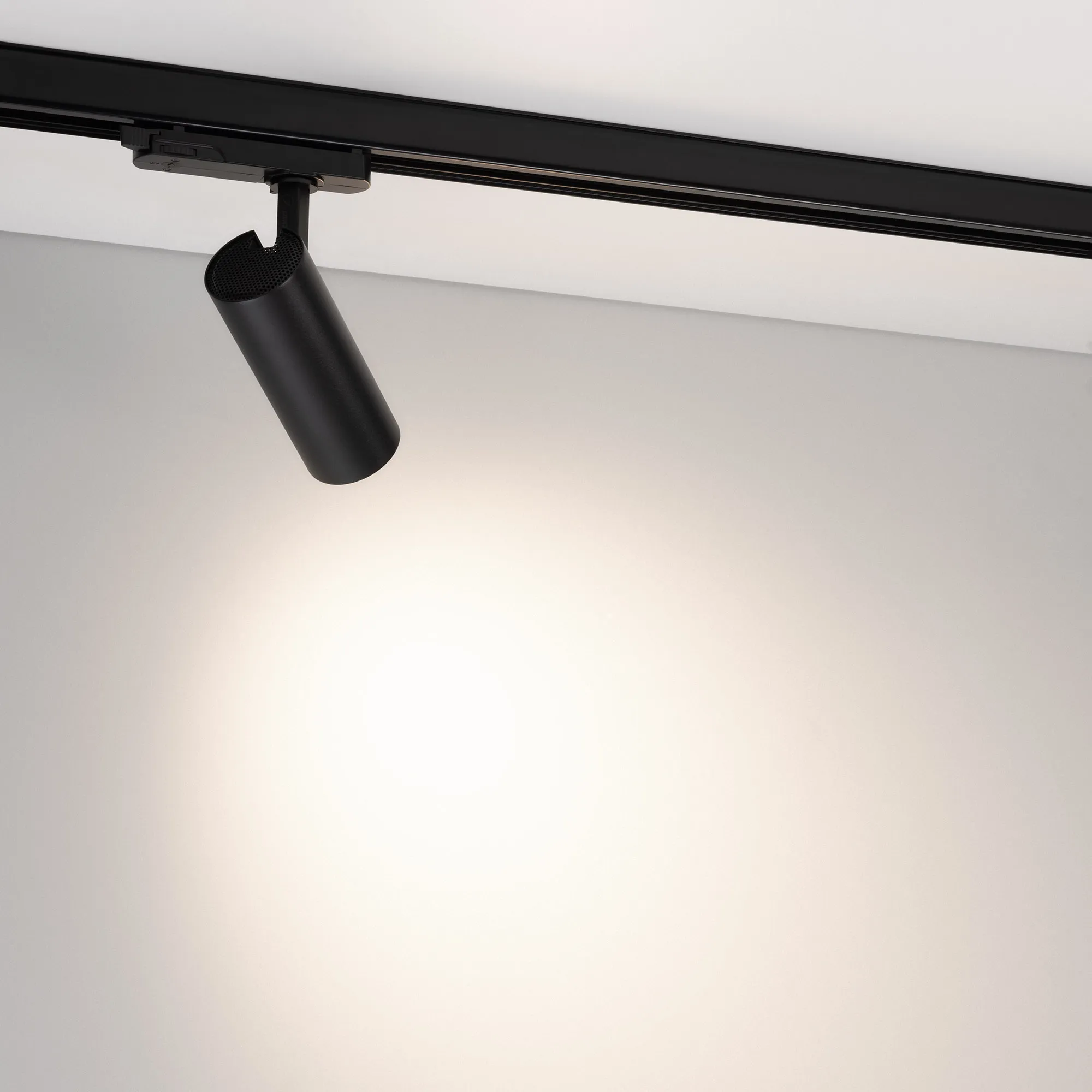 Светильник для треков/шин 4 провода. Мощность 10 Вт, св. поток без решетки honeycomb 1000 лм, 100 лм/Вт, с решеткой honeycomb 660 лм, 66 лм/Вт, дневной 4000 K, CRI>90, угол 55°, напряжение питания 230 В. Черный круглый корпус из алюминия, материал линзы PMMA, степень защиты IP20. Размер: диаметр 55 мм, длина световой части 141 мм. Монтаж на трек 3-фазный. Драйвер встроенный 24-42 В, 250мА., пульсация <5%.