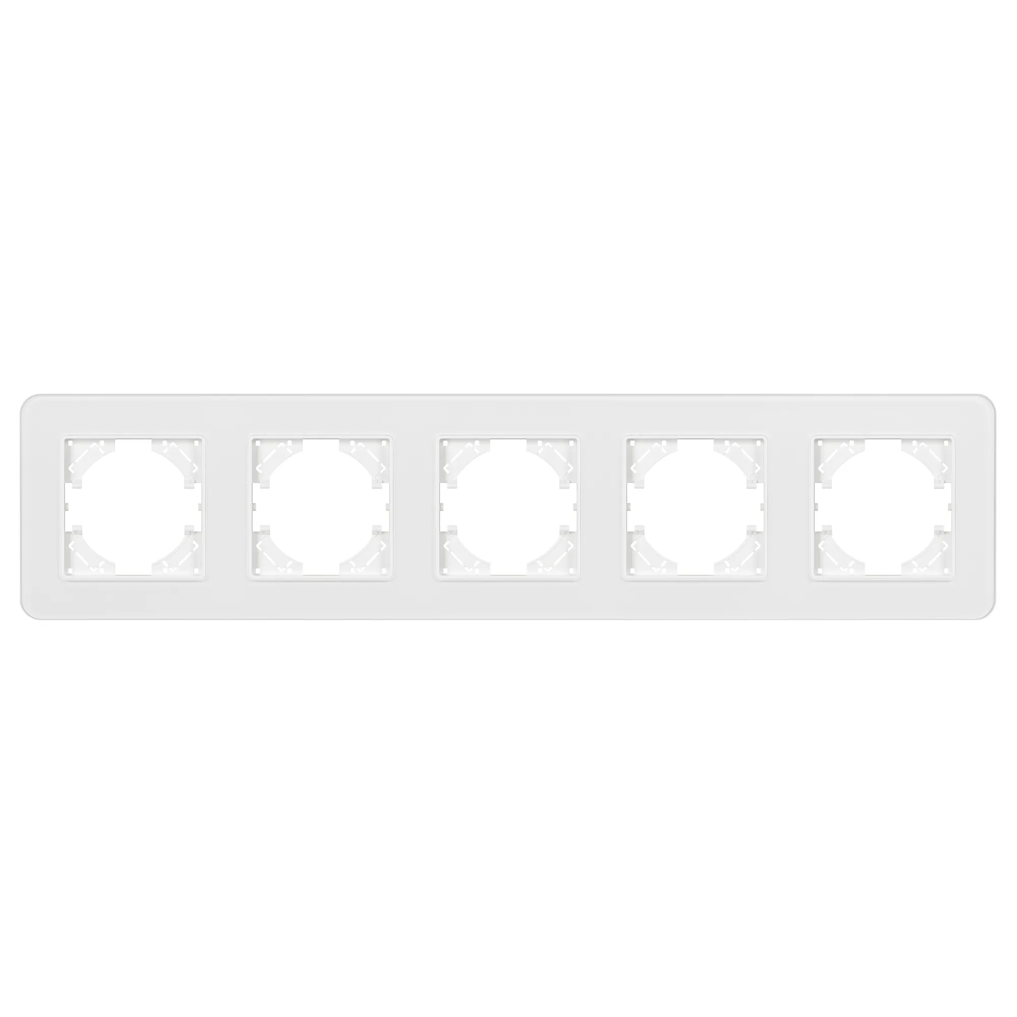 Рамка стеклянная на 5 постов, под встраиваемый механизм. Цвет - белый. Уровень герметичности IP20. Ориентация монтажа - горизонтальная (основным ориентиром служат посадочные выступы для накладки механизма).