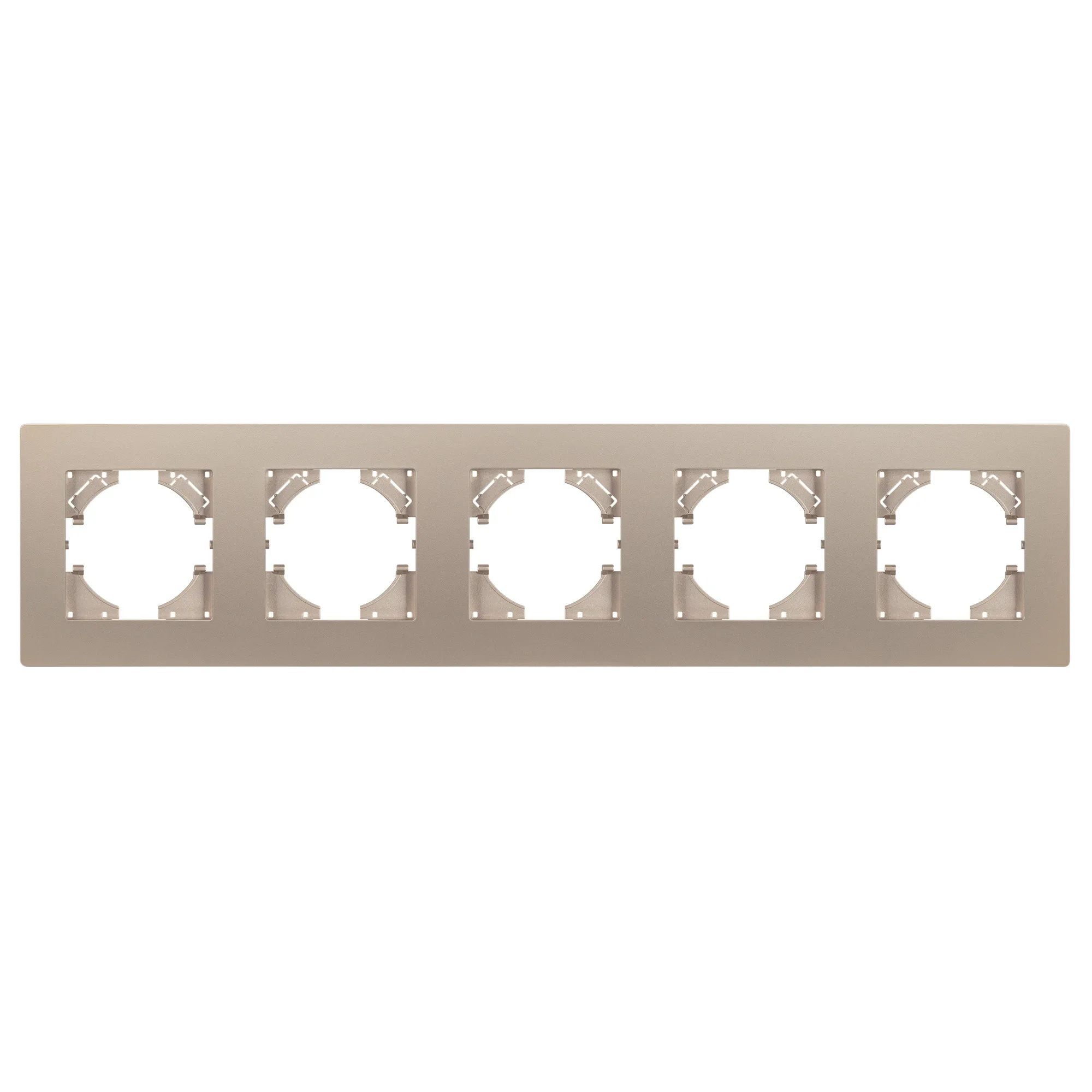 Рамка пластиковая на 5 постов, под встраиваемый механизм. Цвет - золотой. Уровень герметичности IP20. Ориентация монтажа - горизонтальная (основным ориентиром служат посадочные выступы для накладки механизма).