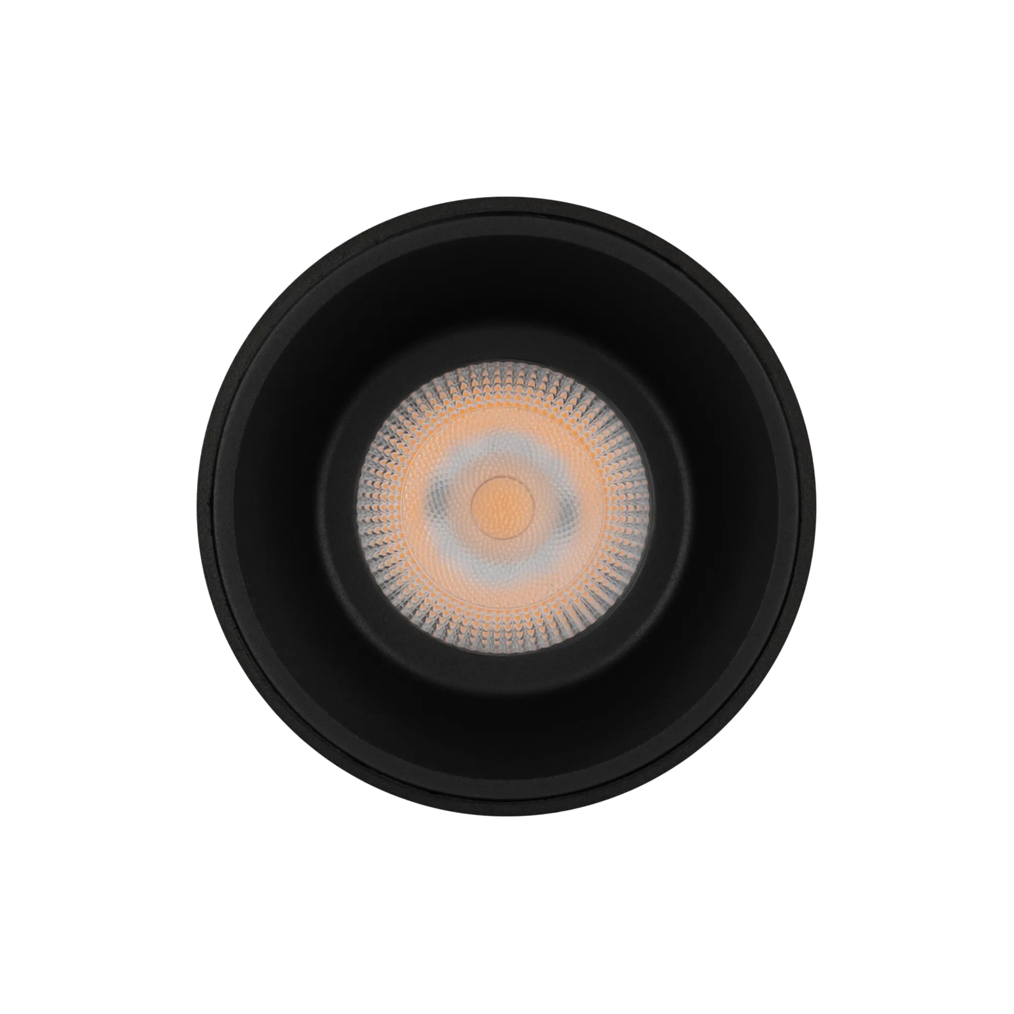 Накладной интерьерный светильник. Мощность 15 Вт, св. поток 1200 лм, 80 лм/Вт, теплый 3000 K, CRI>90, угол 40°, напряжение питания 230 В. Чёрный круглый корпус с черной вставкой из алюминия, степень защиты IP54. Размер: диаметр 75 мм, высота 152 мм. Монтаж накладной. Драйвер 22-40 В, 350 мА, пульсация <1%.