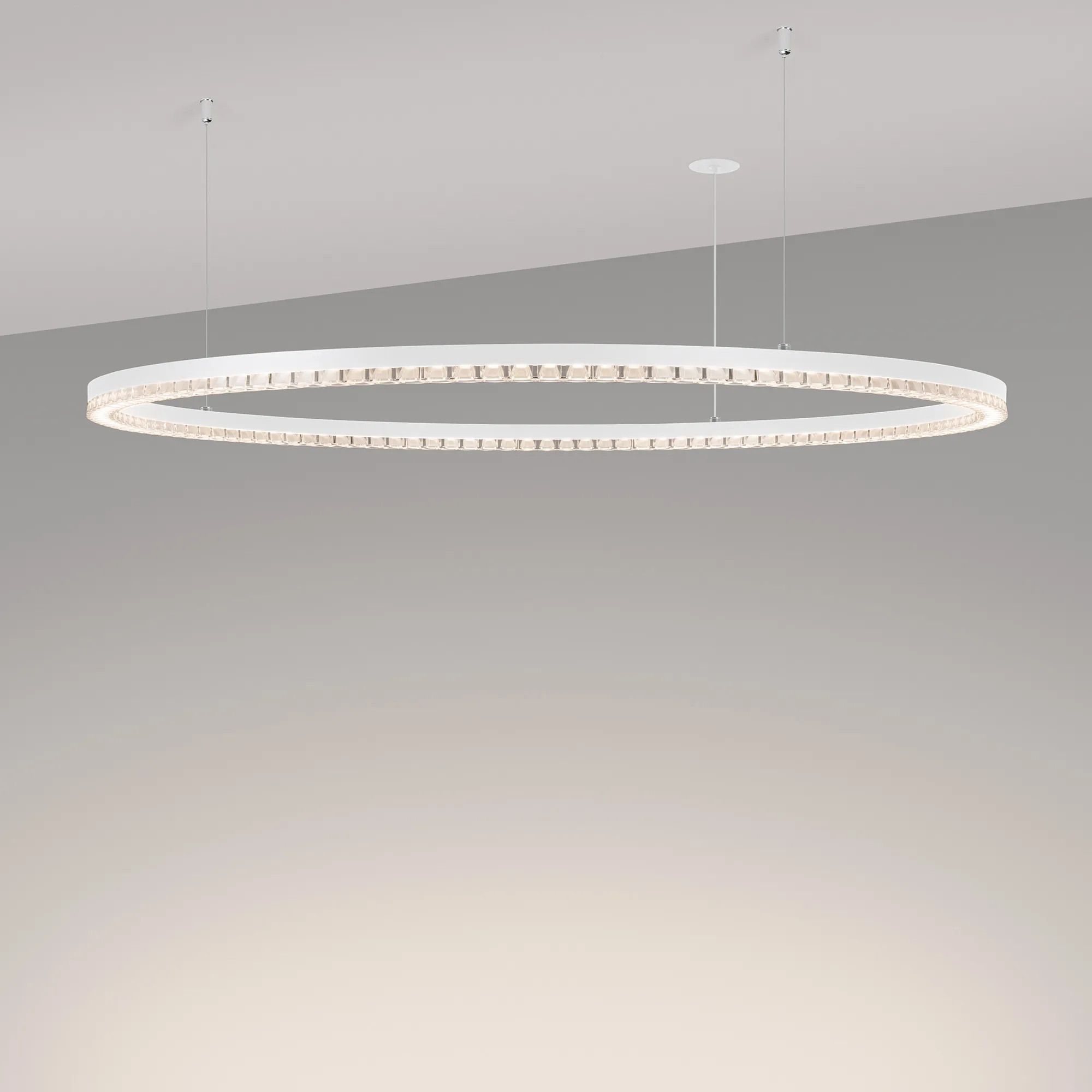 Под заказ. Подвесной светильник. Мощность 60 Вт, св. поток 5250 лм, 80-95 лм/Вт, дневной белый 4000 K, CRI>90, угол 45°, напряжение питания 230 В. Белый круглый корпус из алюминия, экран PMMA, степень защиты IP20. Размер: диаметр 1050 мм, высота 34 мм, ширина профиля 30 мм, размер чаши: диаметр 65 мм, высота 26 мм. Монтаж подвесной, длина подвеса 1200 мм, тип чаши встраиваемый, диаметр установочного отверстия чаши 60 мм. Драйвер (2 шт.) 9-42 В, 700 мА. Пульсация <0,3 %.