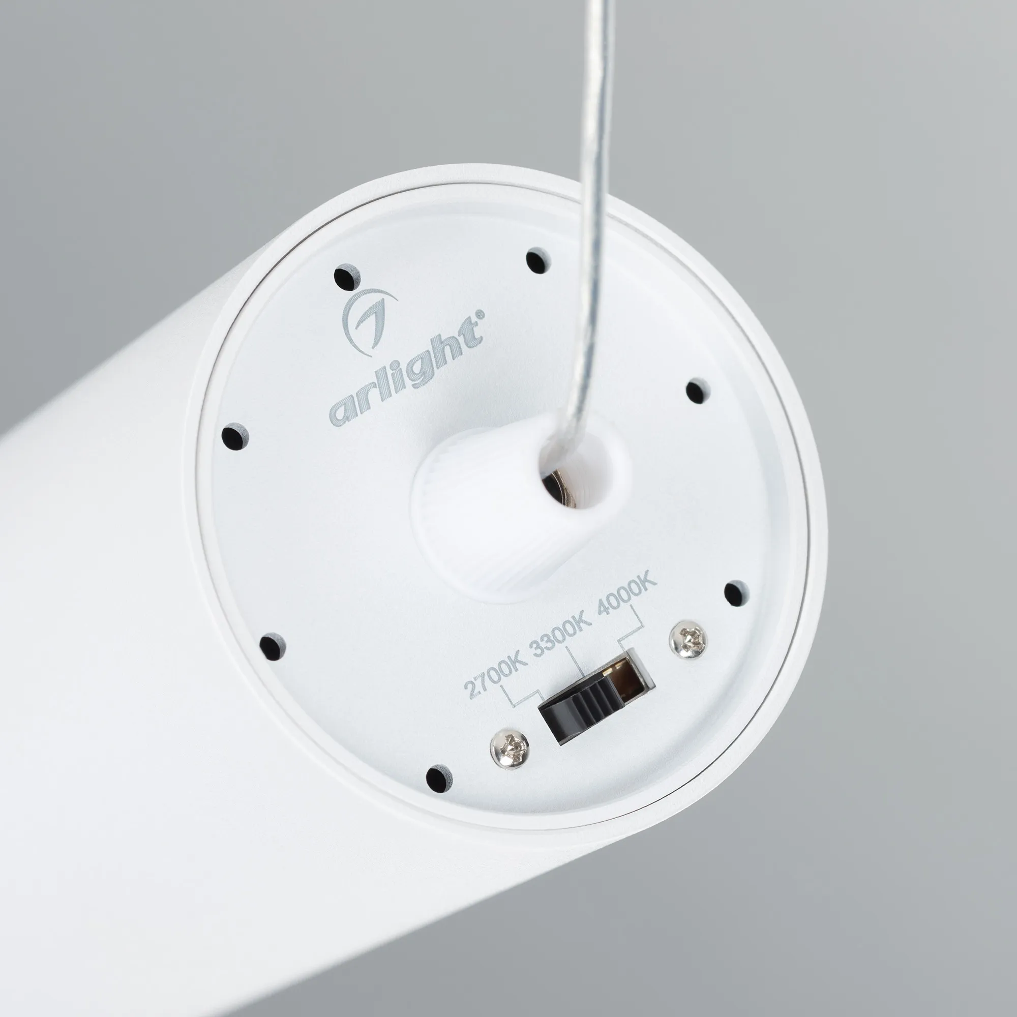 Декоративный подвесной светильник, 15Вт. Изменяемый цвет свечения 2700K/ 3300K/4000K (переключается), световой поток 288-1240 лм, 20-80 лм/Вт, регулируемый угол 8-80°, CRI>90. Корпус круглый, металл, цвет белый, IP20. Размеры светового модуля: DxH Ø60x370(430) мм, подвес регулируемый, макс. длина 1550 мм. Размер чаши Ø75x100 мм. Входное напряжение AC220-240V, мощность 15Вт. Драйвер встроенный 25-40V, 300 мА. Пульсация <1 %. Диммирование по TRIAC.
