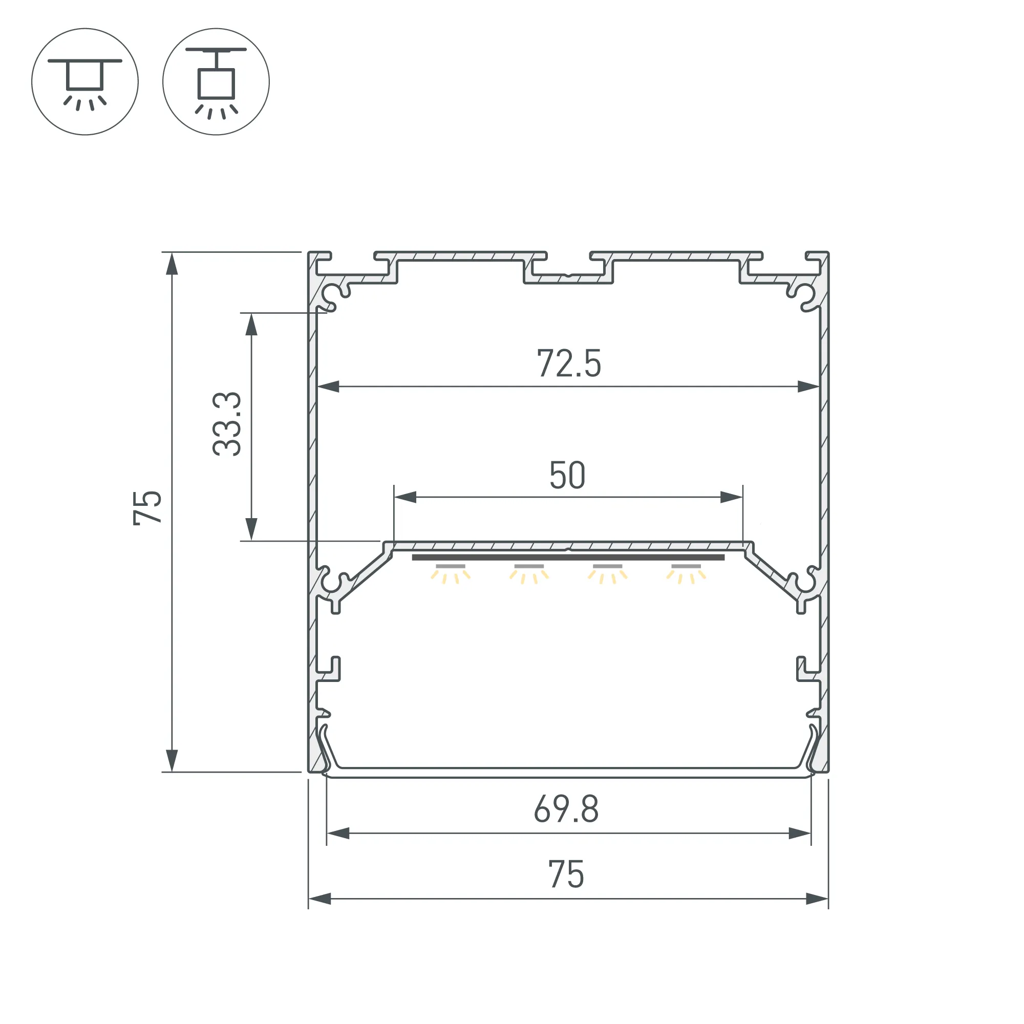Алюминиевый профиль для светодиодных лент и линеек. Цвет - белый RAL9003 (порошковая окраска). Габаритные размеры (L×W×H): 2000x75x75 мм. Ширина площадки для ленты 50 мм. Отсек для БП 72,5х33,3 мм. Экраны, заглушки и другие аксессуары приобретаются отдельно. Цена за 1 метр.