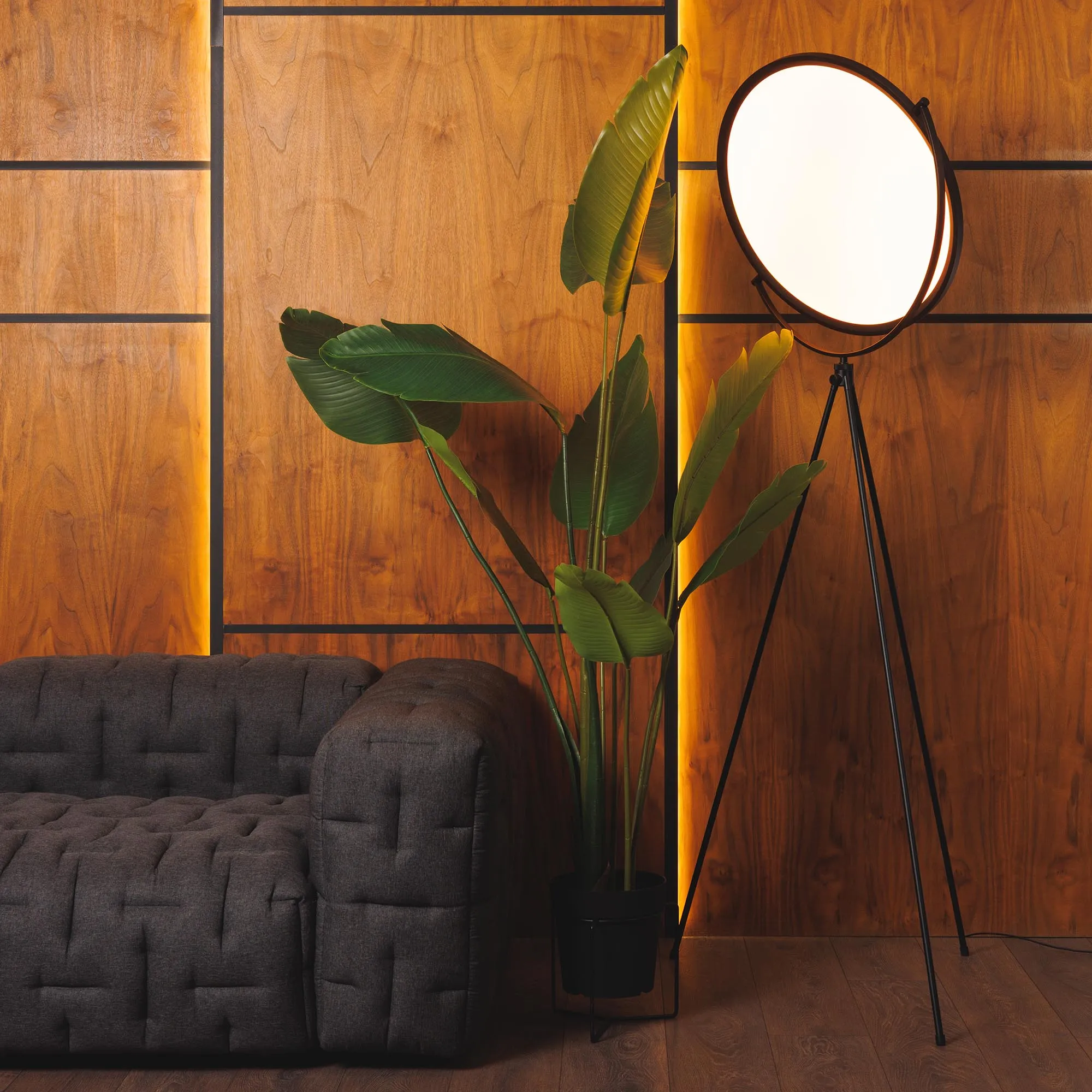 Декоративный напольный светильник с функцией Dim-to-Warm. Мощность 35 Вт, Dim-to-warm 1800K-3000K, CRI>90, угол 120 °, напряжение питания 230 В. Корпус из алюминия черного цвета, экран из PMMA, степень защиты IP20. Размер: диаметр диска 660 мм, диаметр излучающего модуля 595мм, высота с ножкой 1890 м. Угол поворота диска 355°. Длина провода 1300 мм, питание от сети 220-240V. Адаптер в комплекте.