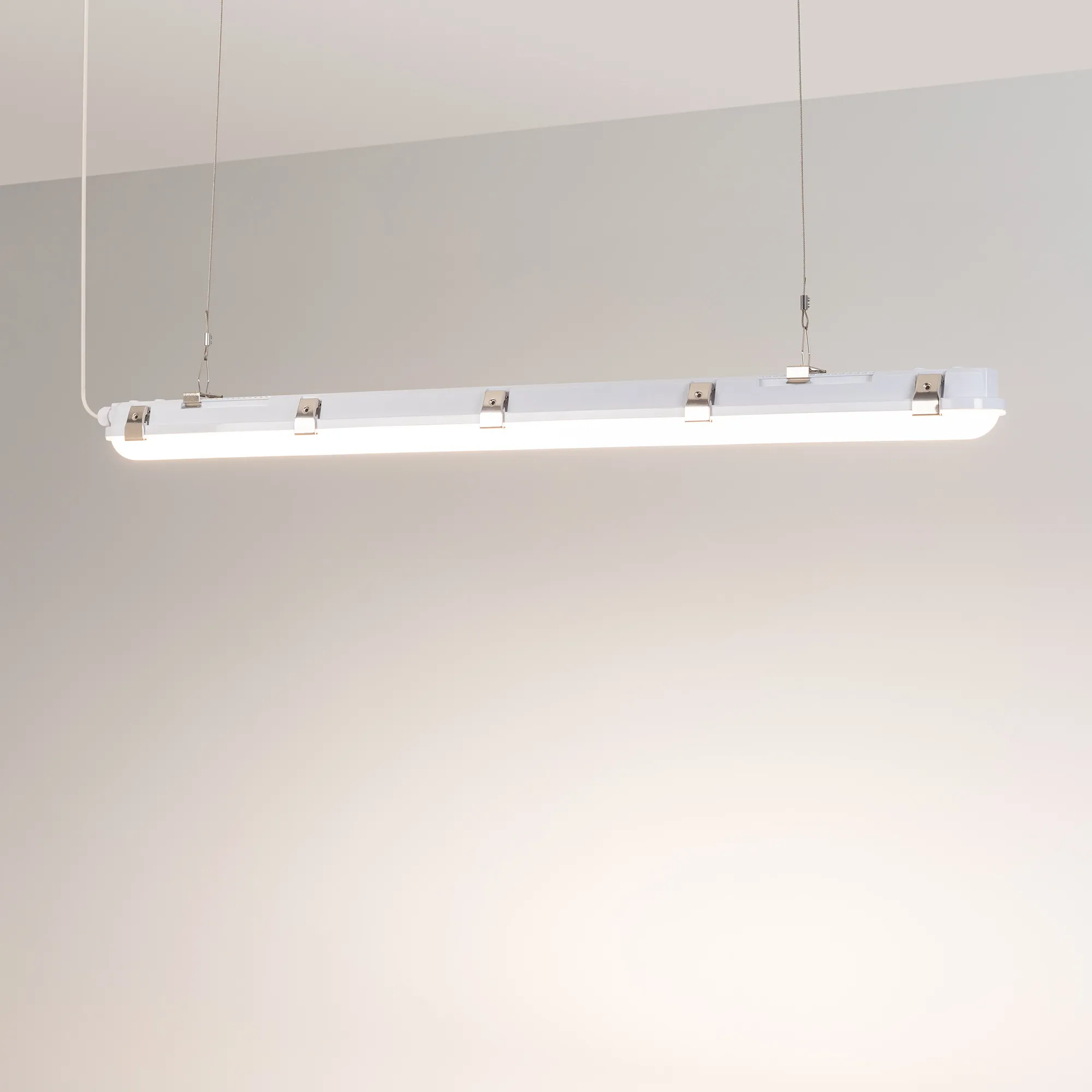 Влагозащищенный линейный светильник для использования в технических помещениях. Мощность светильника 60/56/46/36 Вт. (переключатель на корпусе драйвера). Цвет свечения ДНЕВНОЙ 4000К/ТЕПЛЫЙ 3000К/ХОЛОДНЫЙ 6000К (переключатель на корпусе драйвера), св.поток 8880-9360 лм, CRI(Ra)>80, угол свечения 120°. Корпус прямоугольный, белый пластик, влагозащищенный IP66. Ударопрочность IK08. Размер LxWxH 1750x70x80мм. Питание AC 220-240В, 60 Вт, драйвер встроенный. Температура применения -20°C...+50°C. Материал корпуса и рассеивателя - поликарбонат.