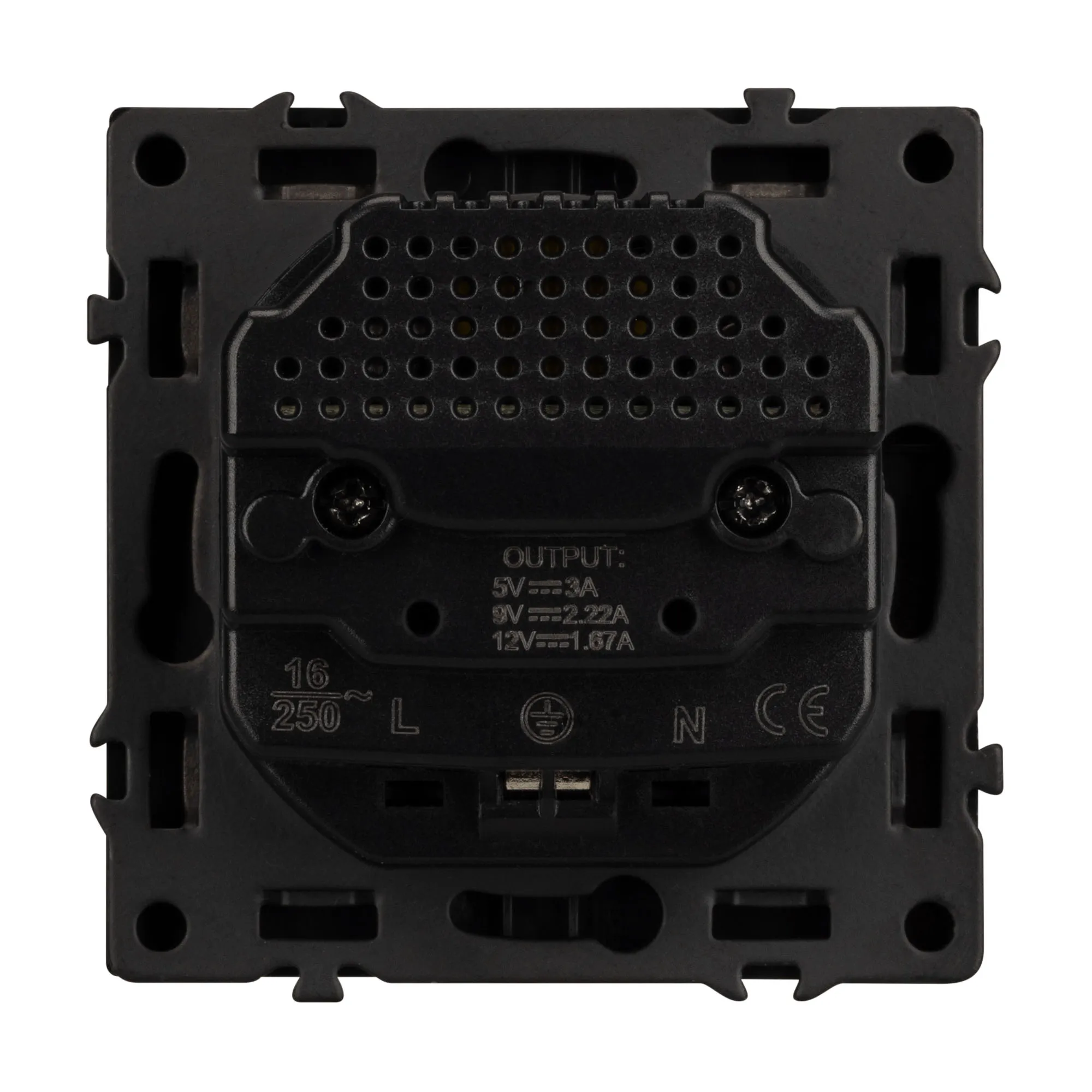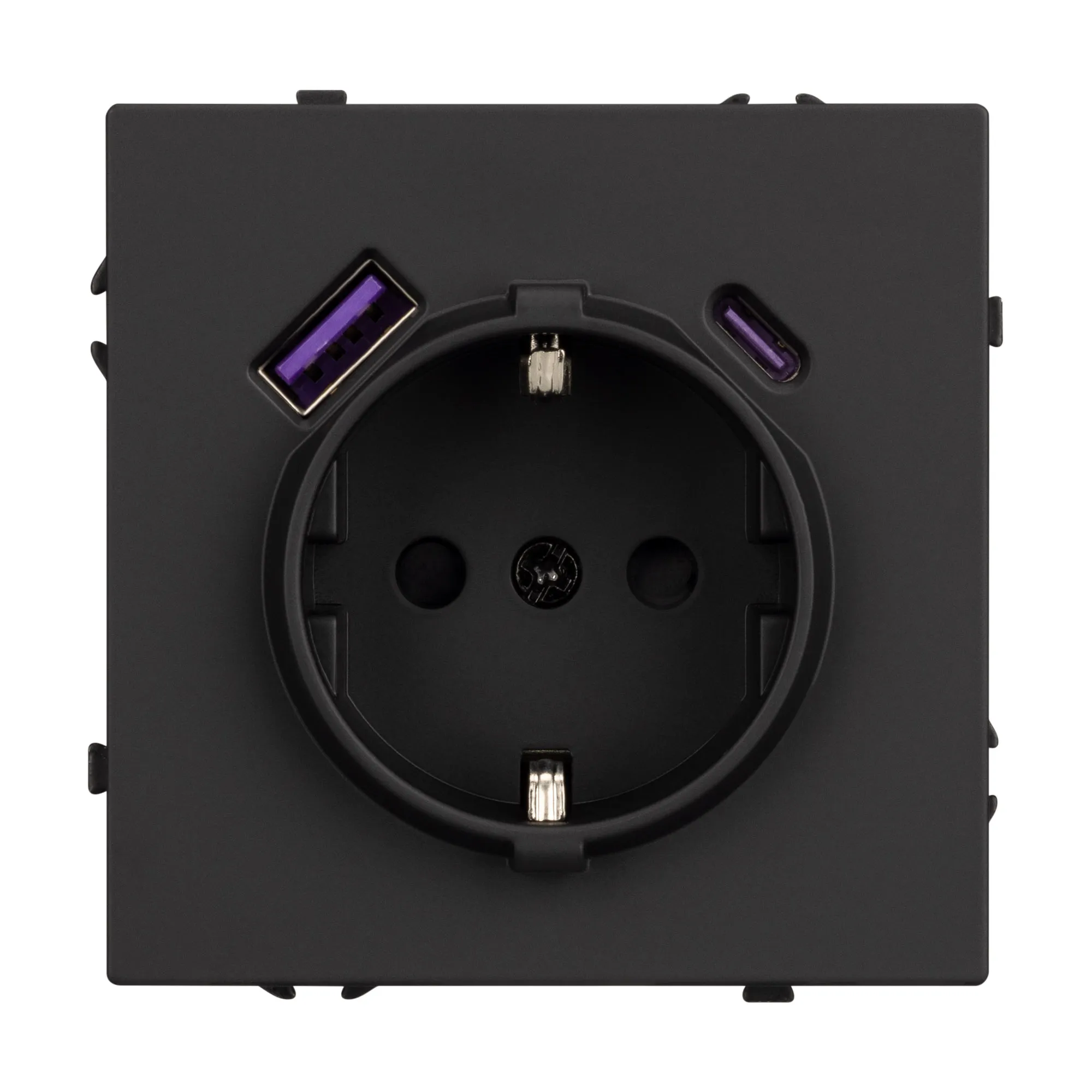 Механизм розетки с заземлением 1 пост и 2 USB Type A+C порта. Цвет - черный оникс, с Soft-Touch покрытием. Без фронтальной рамки. Уровень пылевлагозащиты IP20. Розетка устанавливается в стандартный подрозетник круглого сечения диаметром 60мм.