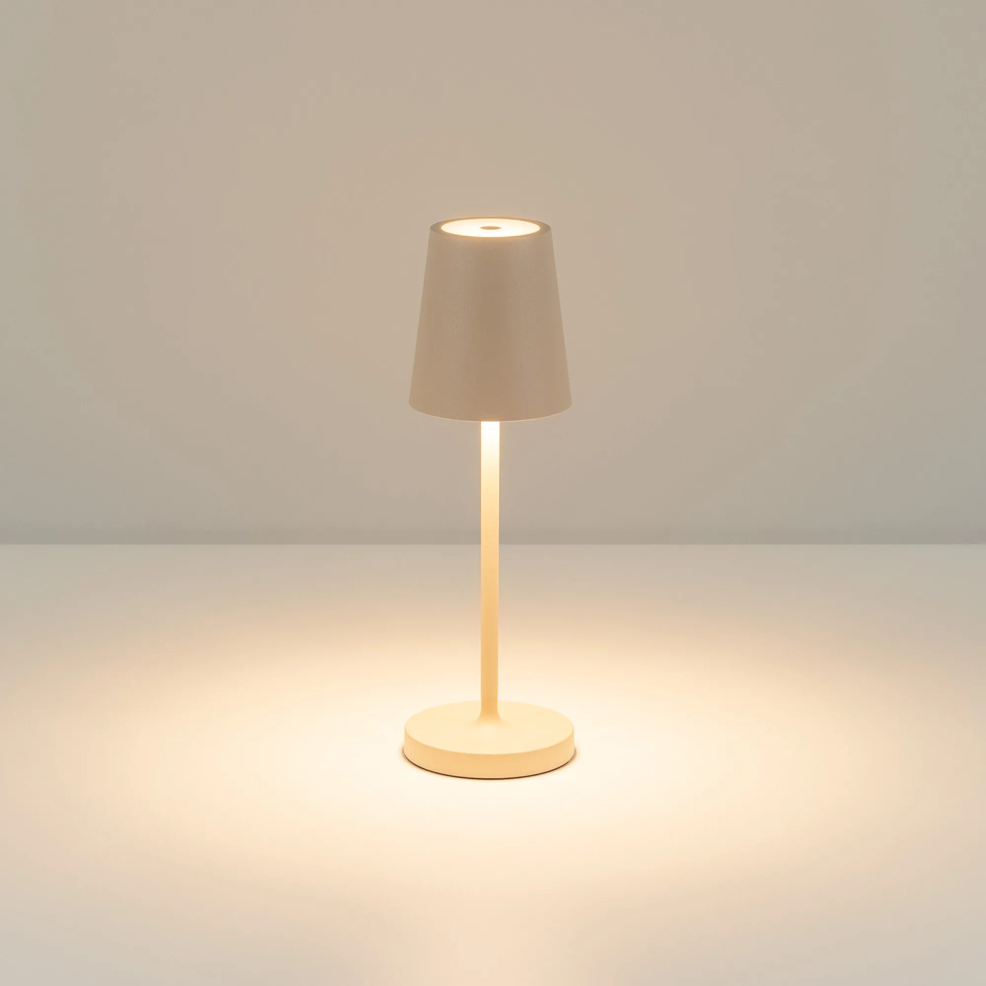 Настольный светильник со встроенным аккумулятором 1.5Вт, алюминиевый корпус, цвет песочный. Цвет ТЕПЛЫЙ БЕЛЫЙ 2200-2700-3000K, св.поток 110-130 лм, CRI(Ra)>80, угол 90°. Размер Ф75x250мм. IP54. Зарядка от сети переменного тока AC220-240V. Тип встроенного аккумулятора 1500мАч Li-ion, напряжение батареи 3.7V