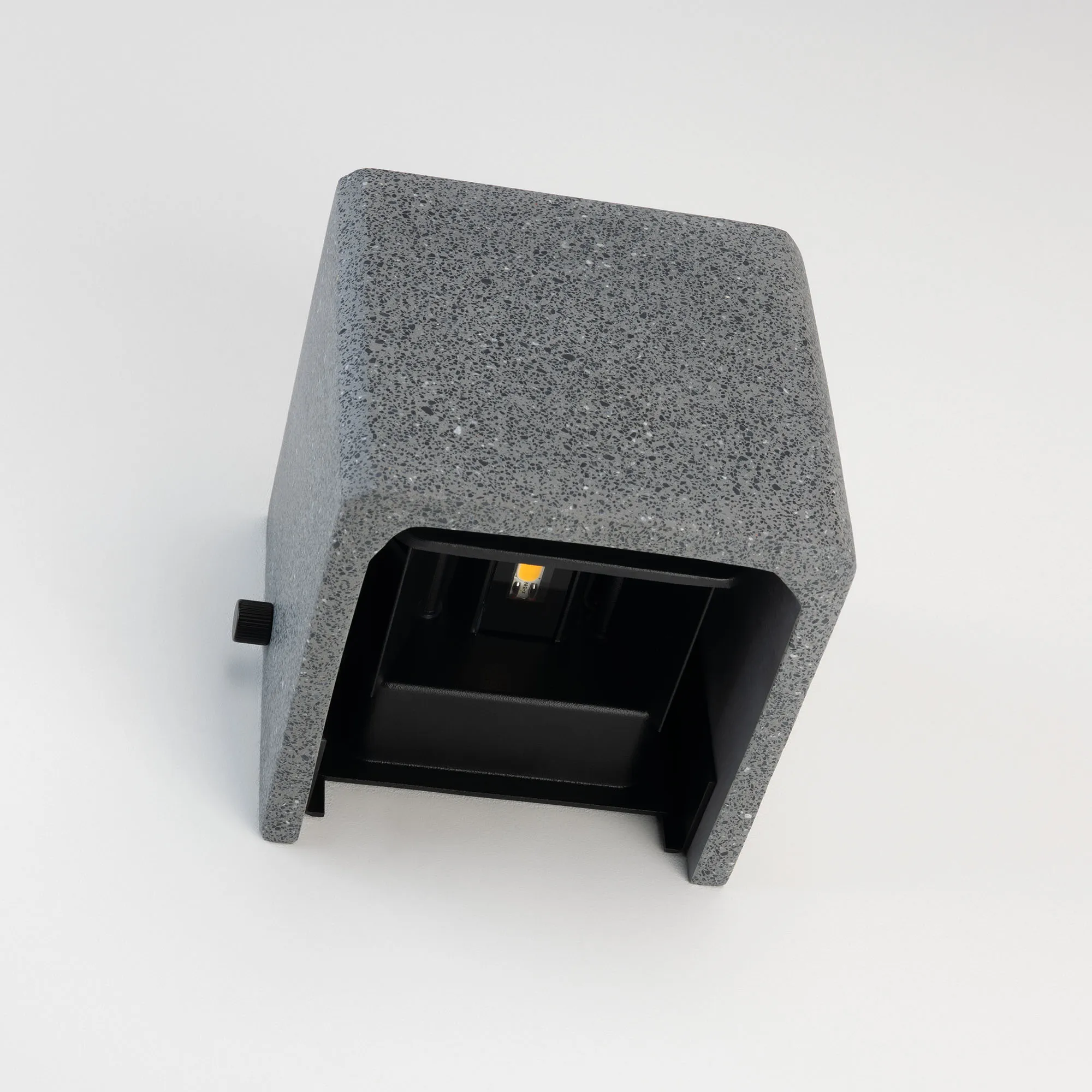 Накладной настенный светильник, свечение вверх/вниз. Мощность 6 Вт, св. поток 286 лм, 49 лм/Вт, теплый 3000 K, CRI>90, изменяемый угол освещения 0°-80°, напряжение питания 230 В. Фигурный корпус из бетона темно-серого цвета и алюминия, экран ударопрочный PC, степень защиты IP65. Размер: длина 120 мм, ширина 120 мм, высота 120 мм. Монтаж накладной. Драйвер встроенный, пульсация <0.5%.