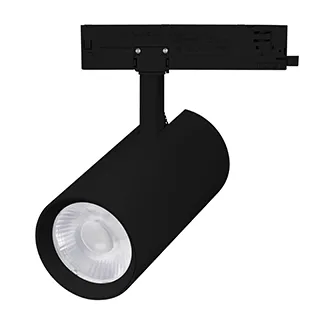 Светильник для треков/шин 4 провода с управлением DALI. Мощность 30 Вт, св. поток без решетки honeycomb 3000 лм, 100 лм/Вт, с решеткой honeycomb 1980 лм, 66 лм/Вт, теплый 3000 K, CRI>90, угол 55°. Черный круглый корпус из алюминия, материал линзы PMMA, степень защиты IP20. Размер: диаметр 90 мм, длина световой части 141 мм. Входное напряжение AC220-240V. Драйвер встроенный 10-42В (300-800 мА), 50/60Гц, максимальная мощность 42W. Монтаж на трек 3-фазный.