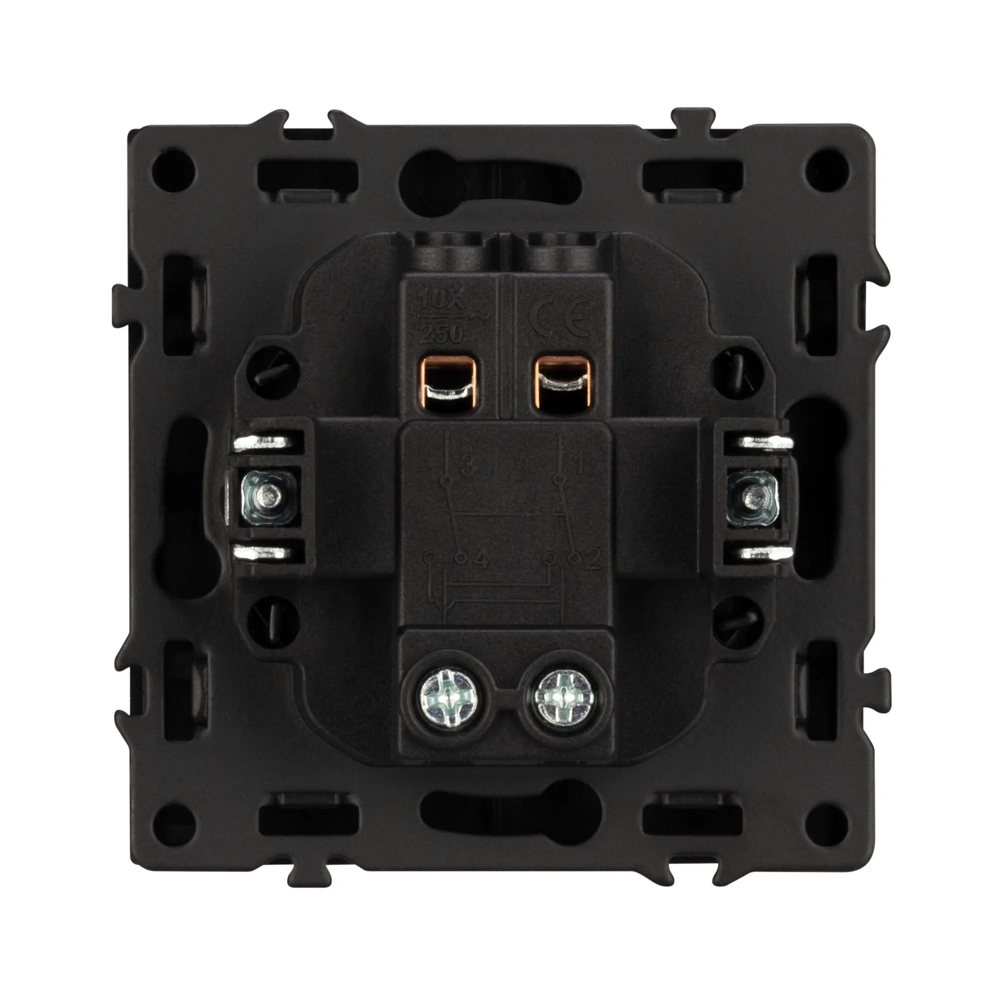 Механизм выключателя света клавишный на 1 пост 1 клавиша (перекрёстный). Цвет - черный, с Soft-Touch покрытием. Без фронтальной рамки. Уровень пылевлагозащиты IP20. Выключатель устанавливается в стандартный круглый подрозетник круглого сечения диаметром 60мм.