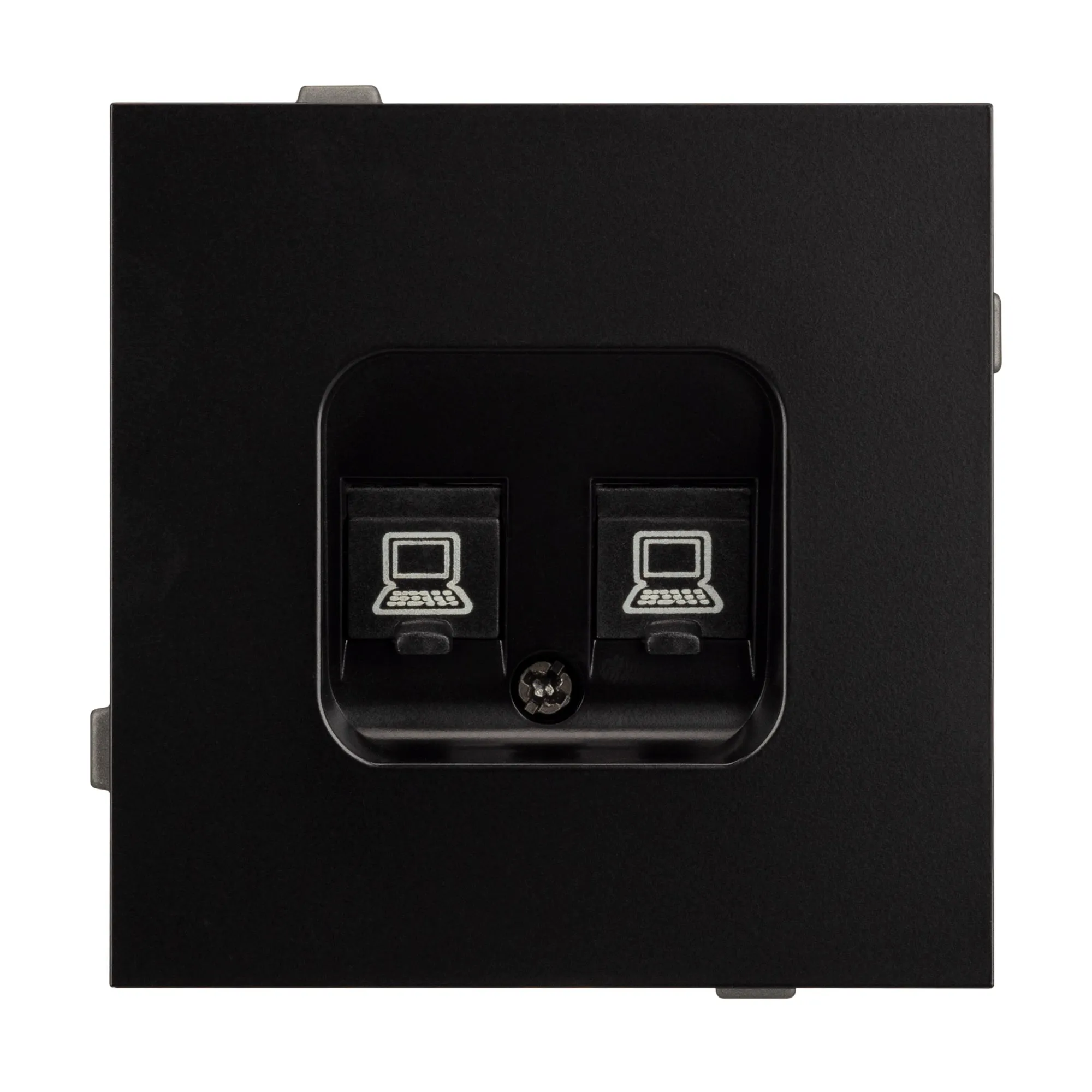 Механизм компьютерной розетки на 2 поста 6-й категории. Цвет - черный. Без фронтальной рамки. Уровень пылевлагозащиты IP20. Розетка устанавливается в стандартный подрозетник круглого сечения диаметром 60мм.
