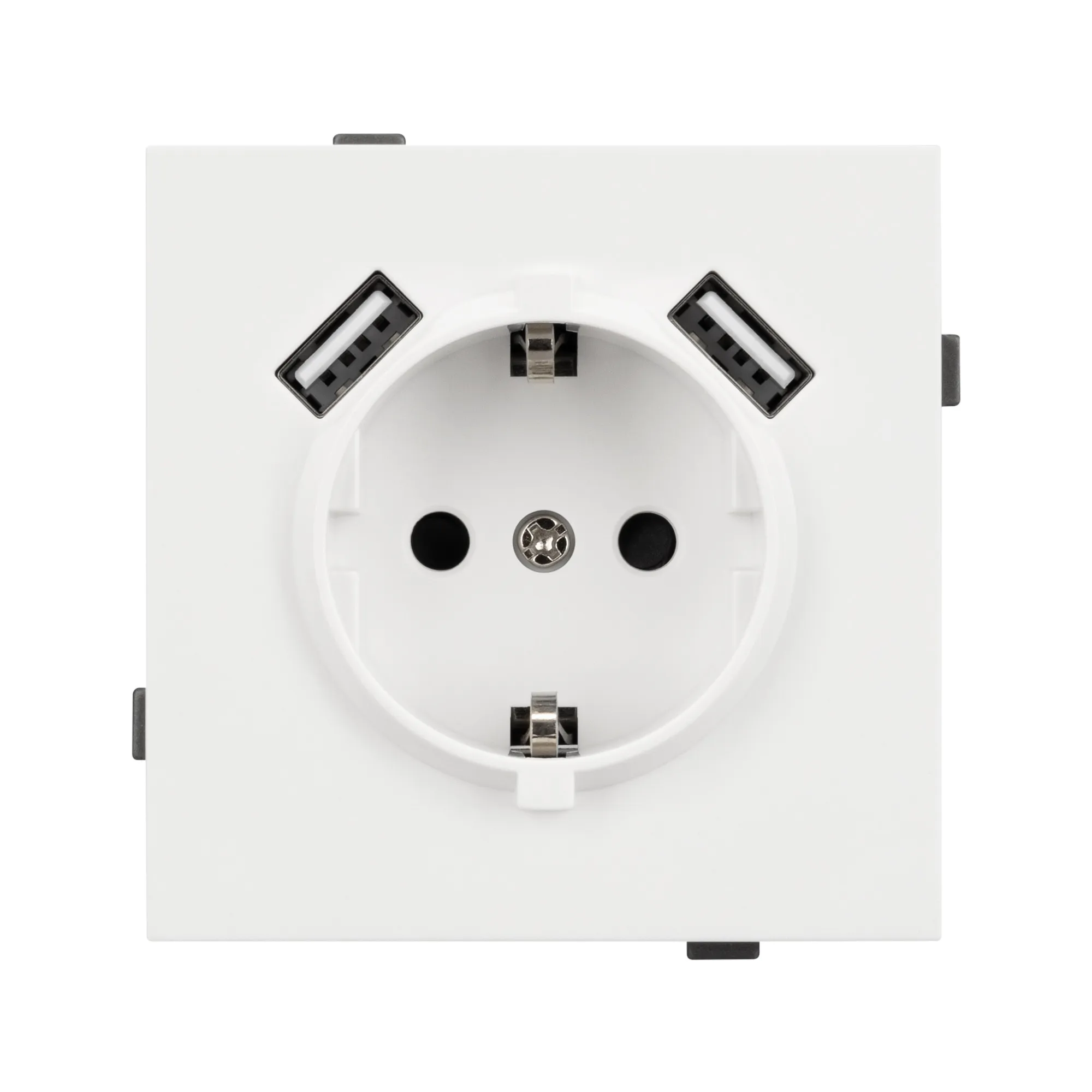 Механизм розетки с заземлением на 1 пост и 2USB Type A порта. Цвет - матовый белый, с Soft-Touch покрытием. Без фронтальной рамки. Уровень пылевлагозащиты IP20. Розетка устанавливается в стандартный подрозетник круглого сечения диаметром 60мм.