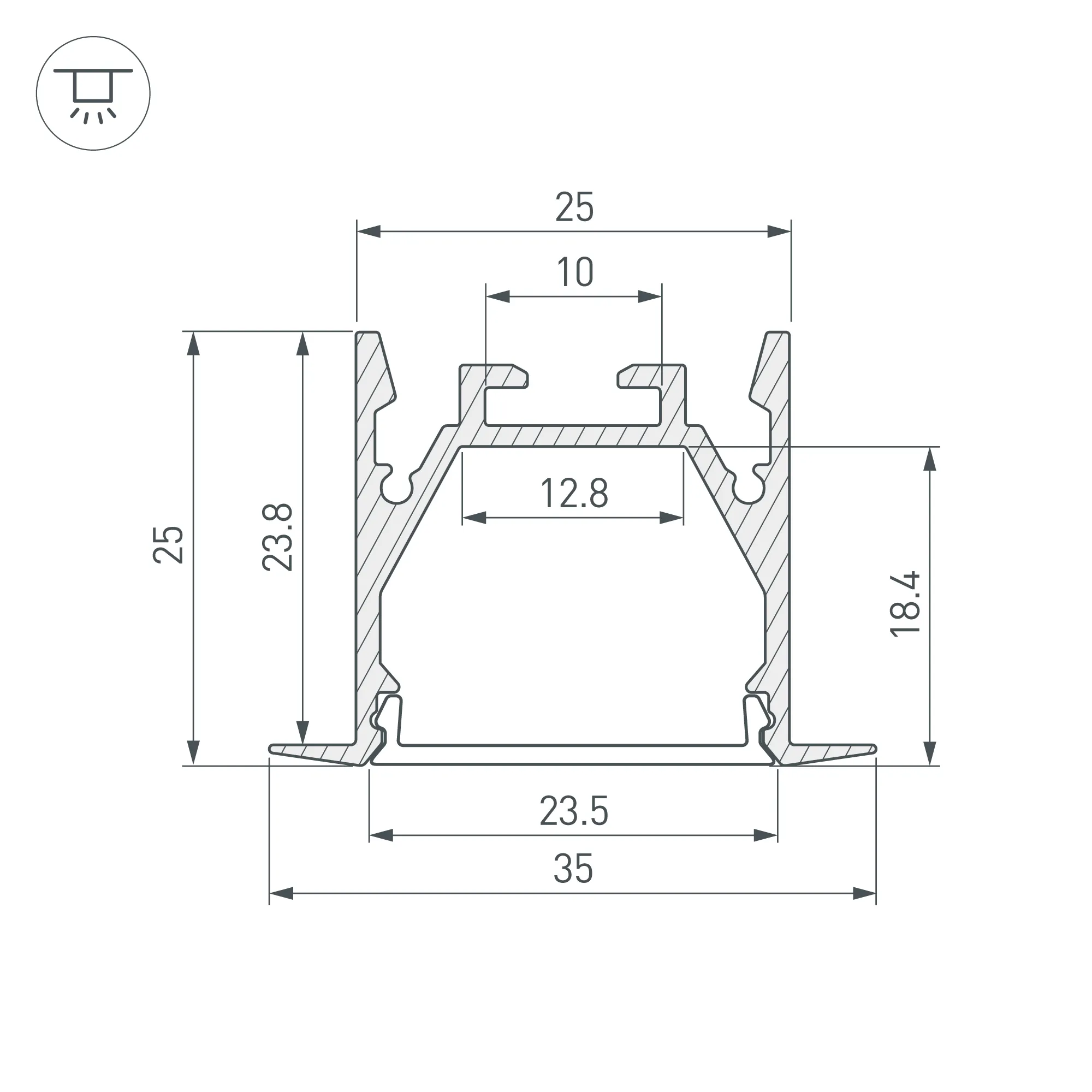Алюминиевый анодированный профиль для светодиодных лент и линеек. Цвет - чёрный. Габаритные размеры (L×W×H): 2000x35x25 мм, паз для установки 25 мм. Ширина площадки для ленты 12,8 мм. Экраны, заглушки и другие аксессуары приобретаются отдельно. Цена за 1 метр.