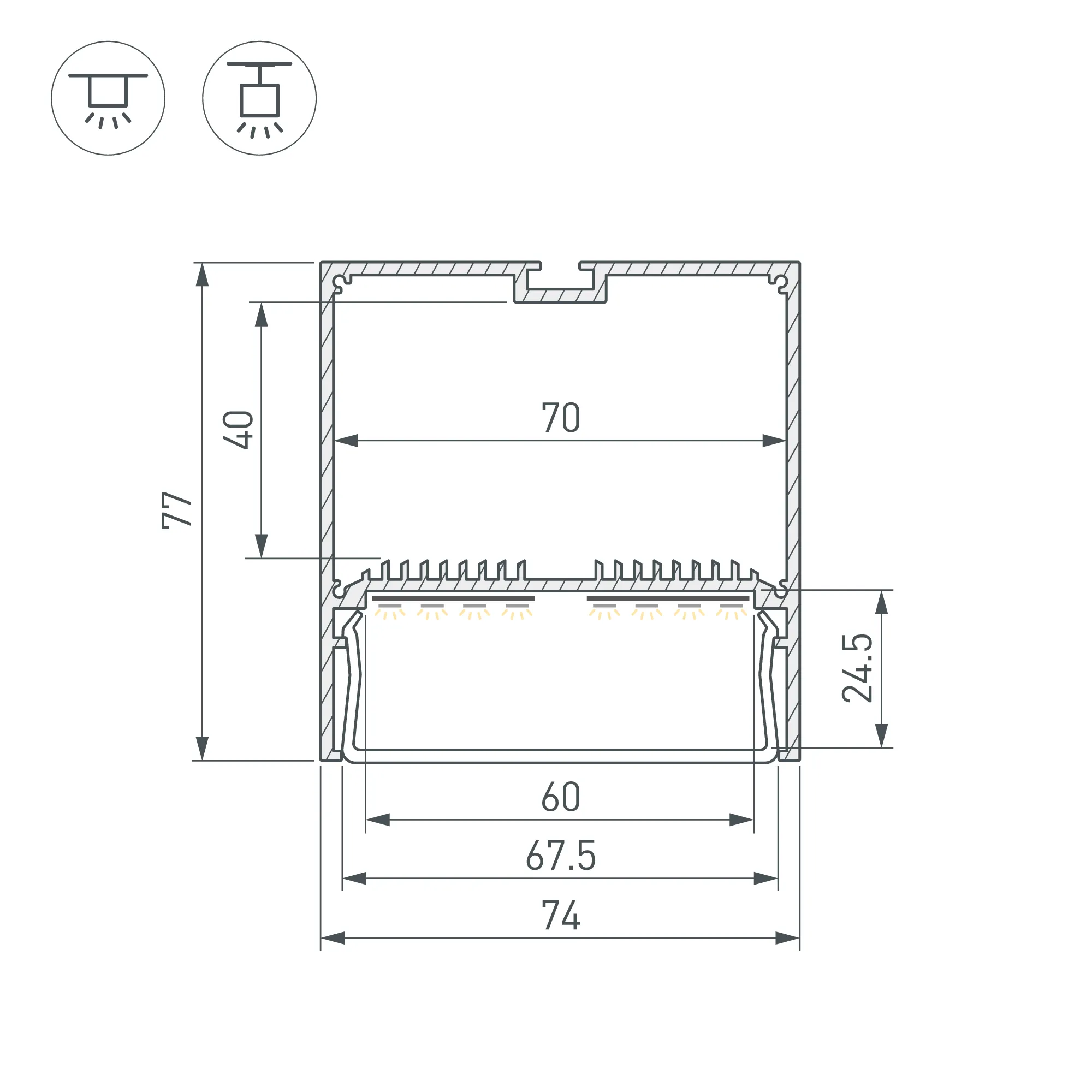 Алюминиевый анодированный профиль для светодиодных лент и линеек. Габаритные размеры (L×W×H): 2000x74x77 мм. Ширина площадки для ленты 60 мм. Отсек для БП 70х40мм. Экраны, заглушки и другие аксессуары приобретаются отдельно. Цена за 1 метр.