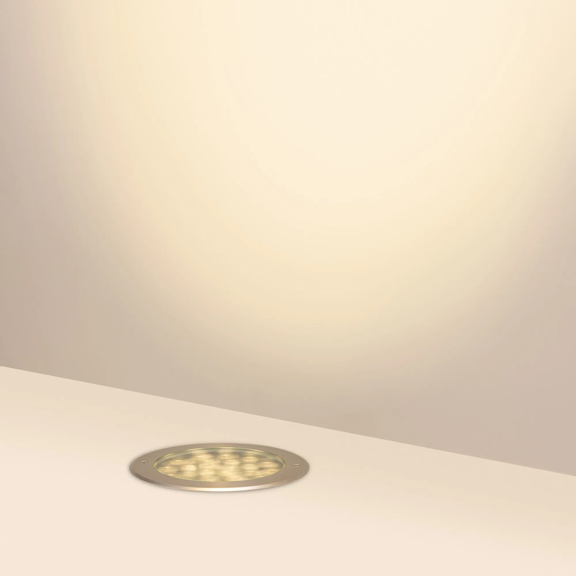 Встраиваемый светодиодный светильник для грунта и пола. Мощность 48Вт, световой поток 3250 лм, цвет теплый 3000К. CRI(Ra)>80, угол 20°. Круглый влагозащищенный корпус IP67, нержавеющая сталь. Экран закалённое стекло. Питание 230В, 48Вт. Размер DxH Ø260x150мм. Установка в отверстие DxH Ø239x144мм.