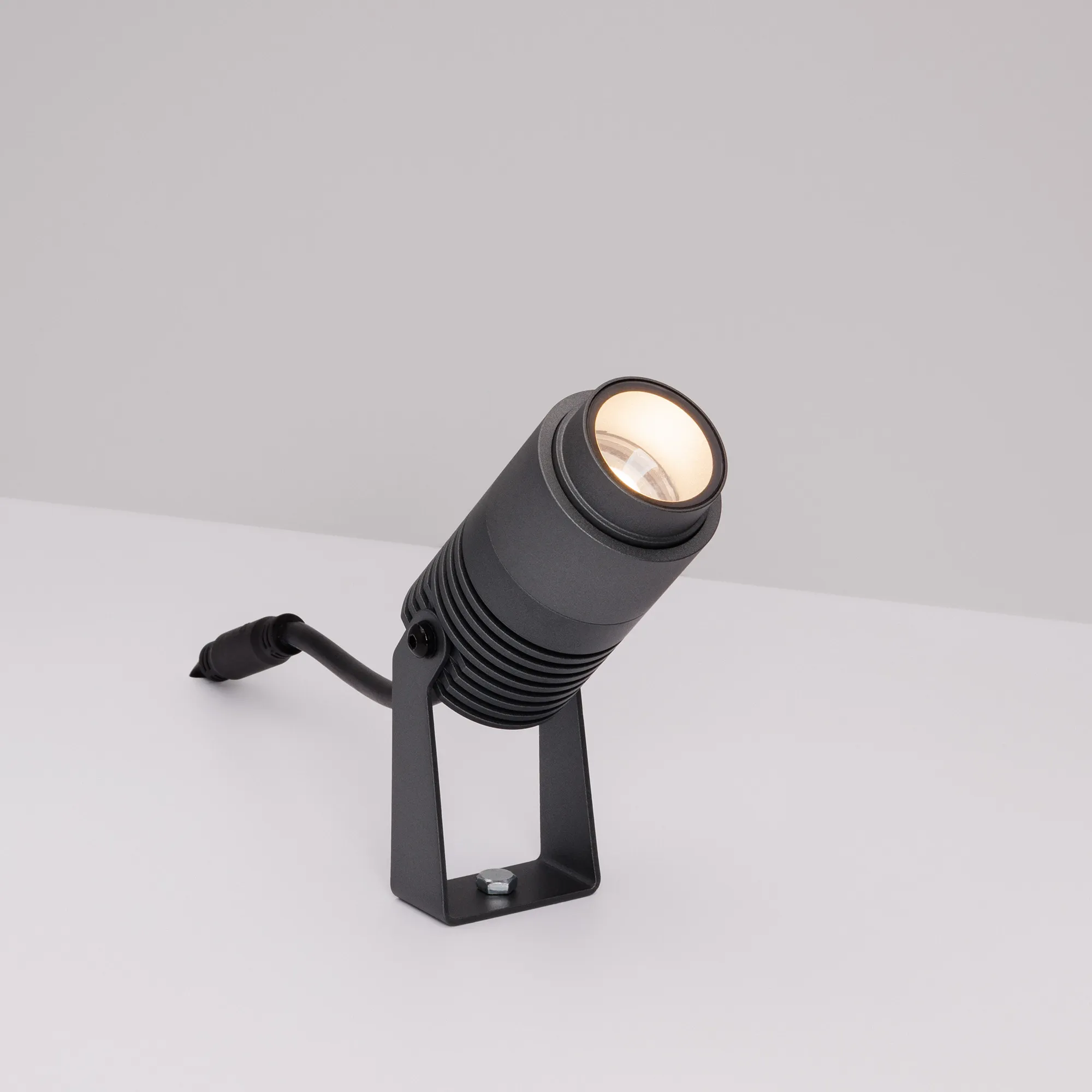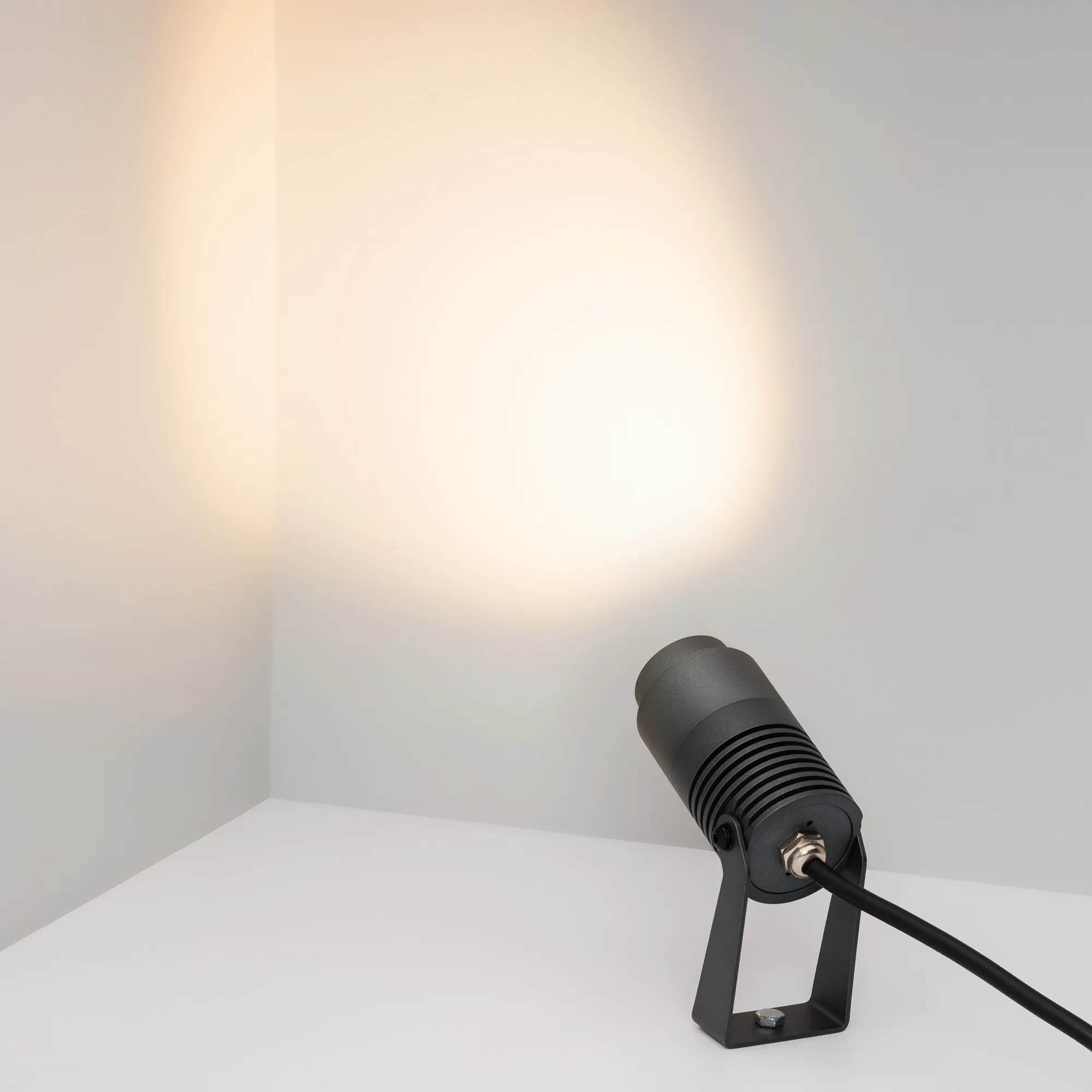 Уличный светодиодный прожектор, мощность 8Вт, регулируемый угол освещения 10-40°. Цвет ТЕПЛЫЙ 2700К, световой поток для угла 10° 240 для угла 40° 420лм. Влагозащищенный корпус IP67 - темно-серый алюминий, экран из закаленного стекла. Угол поворота корпуса в вертикальной плоскости 135°. Питание 230В, мощность 8 Вт. Размеры DxH - Ø52x103мм. В комплекте 1м провод.