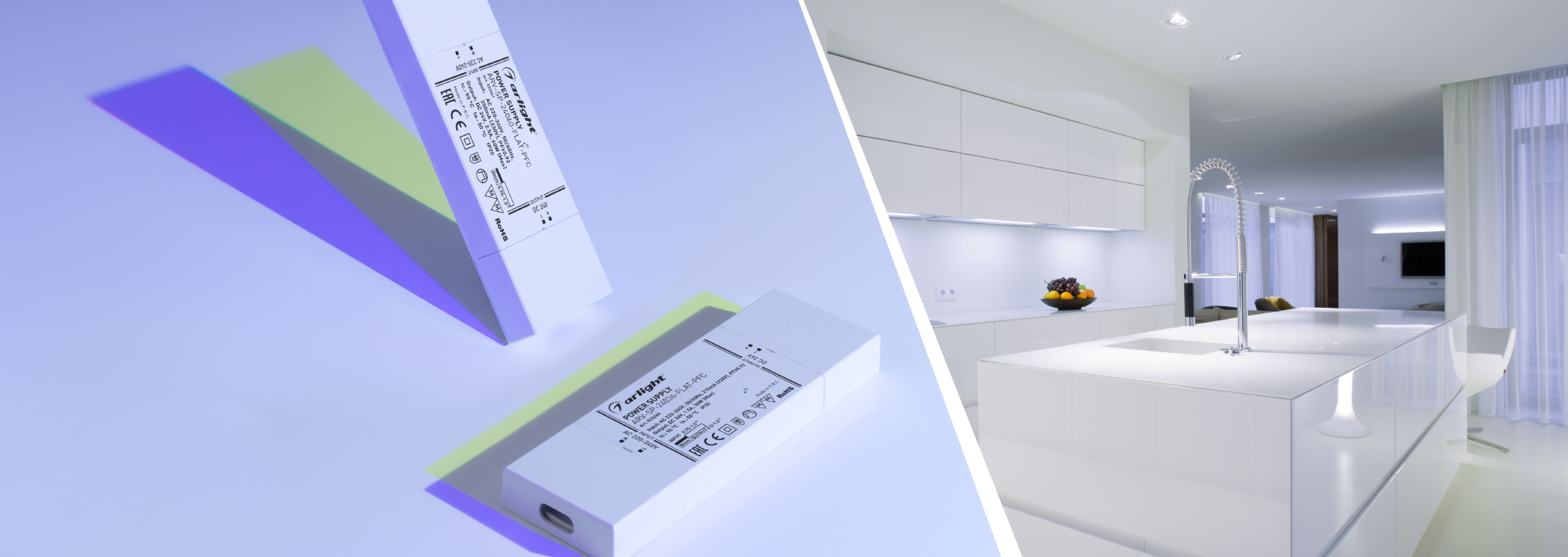 Блоки питания идеально подходят для организации освещения рабочей поверхности кухни, зеркал, мебели, ниш с помощью светодиодных лент и светильников с напряжением питания 24 В.